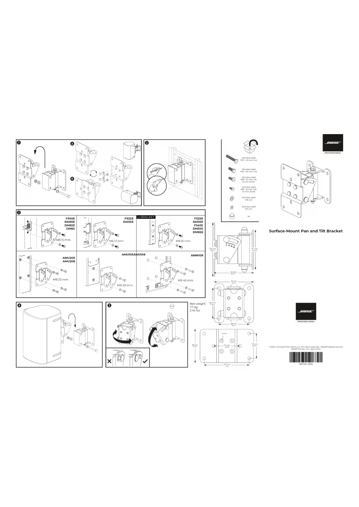 - N’installez pas le support ou le produit à proximité d’une source de chaleur, telle qu’une cheminée, un radiateur, une arrivée d’air chaud ou tout autre appareil (notamment des amplicateurs) produisant de la chaleur. Importateur pour l’UE : Transom Post Netherlands B.V., Keizersgracht 391A, 1016 EJ, Amsterdam | Importateur pour le Royaume-Uni : Transom Post Netherlands UK, Squires House 205a High Street, West Wickham, BR4 0PH | Importateur pour le Japon : Transom Post International Japan Co., Ltd. 3-3-16 Nihonbashi-hongokucho, Chuo-ku, Tokyo | Importateur pour l’Australie : Transom Post Australia Pty. Ltd., Level 14, 60 Margaret Street, Sydney, NSW 2000 Bose Professional, 117 South St, Hopkinton, MA 01748 USA Bose est une marque commerciale de Bose Corporation. ArenaMatch, DesignMax et FreeSpace sont des marques commerciales de Transom Post OpCo LLC. ©2024 Transom Post OpCo LLC. Toute reproduction, modication, distribution ou autre utilisation, même partielle, de ce document est interdite sans autorisation écrite préalable. Informations relatives à la garantie Cet appareil est couvert par une garantie limitée. Pour en savoir plus sur la garantie, consultez BoseProfessional.com/warranty. DEUTSCH WARNHINWEISE Bitte lesen Sie alle Sicherheitshinweise und Gebrauchsanleitungen durch und bewahren Sie sie auf. Enthält kleine Teile, die verschluckt werden können und eine Erstickungsgefahr darstellen. Nicht für Kinder unter 3 Jahren geeignet.
