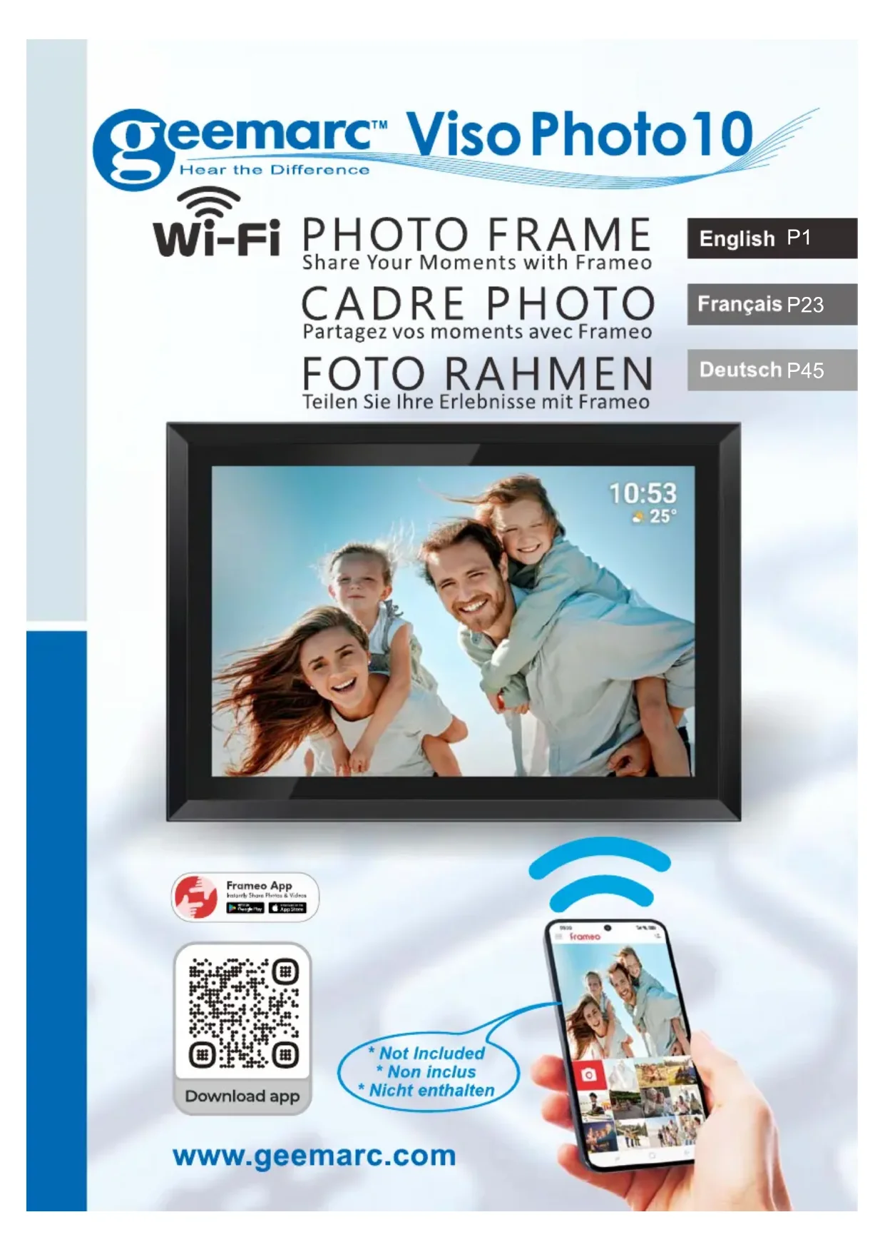 AVEC VOTRE APPAREIL SPECIFIQUE. Sauvegarde automatique Si coché, votre cadre effectuera automatiquement une sauvegarde dans les 30 heures suivant la réception de nouvelles photos ou suivant une modification des paramètres. Restaurer à partir d’une sauvegarde Avant d’effectuer une restauration de votre cadre, vérifiez que la sauvegarde que vous souhaitez utiliser est bien à jour. Vous pouvez faire cela en confirmant la date sous « Sauvegarder le cadre sur un périphérique de stockage externe (par ex. une carte micro SD) ». Si par ex. la dernière sauvegarde est trop ancienne ou qu’aucune sauvegarde n’est présente, alors appuyez sur le bouton « Sauvegarder le cadre sur un périphérique de stockage externe (par ex. une carte micro SD) ». NB : Pour que l’ancien et le nouveau cadre restent opérationnels en même temps après la restauration à partir de la sauvegarde, veuillez-vous assurer au préalable que les deux cadres sont mis à jour à la dernière version. Si vous souhaitez restaurer une sauvegarde de votre cadre qui a déjà été effectué, alors vous devez d’abord réinitialiser le cadre. Vous pouvez faire cela en appuyant sur le bouton « Réinitialiser le cadre ». Cela supprimera toutes les données contenues dans votre cadre photo et il affichera l’écran de configuration. Sur l’écran de configuration, vous pouvez appuyer sur le bouton « Restaurer depuis une sauvegarde », qui restaurera votre cadre à l’identique. Si le bouton « Restaurer depuis une sauvegarde » n’est pas visible, vérifiez que votre périphérique de stockage externe (par ex. une carte micro SD) est correctement inséré. Réinitialiser le cadre Efface toutes les données de votre cadre ou fait une restauration en mode usine. Cela supprimera toutes vos photos, amis, connexions et paramètres de manière permanente.41 Aide Guide d’installation rapide Pour afficher la procédure rapide d’enregistrement de votre cadre à un ami. Assistance Pour afficher une liste des librairies open source utilisées dans l’application, et les licences associées. Partager des données analytiques anonymes Le partage des données analytiques anonymes nous aide énormément à améliorer l’application Frameo. Nous comprenons si vous ne souhaitez pas partager ces données avec nous. Laissez la boîte cochée si vous souhaitez nous aider à améliorer Frameo. Décochez la boîte pour interdire le partage des données analytiques anonymes. À propos Marque du matériel et numéro de modèle Modèle et identifiant de votre cadre photo. ID de pair Il s’agit d’un identifiant unique pour votre cadre photo. Lorsque vous prenez contact avec notre service d’assistance, veuillez inclure cet identifiant avec votre message. Version de votre cadre photo Affiche la version du logiciel de votre cadre photo actuellement installé. Rechercher des mises à jour Pour vérifier si une mise à jour est disponible pour votre cadre. Programme beta Si coché, l’appareil participera au programme beta, et il recevra des mises à jour plus fréquemment, avant les appareils utilisant les mises à jour normales. Attributions à des tiers Permet de contrôler toutes les autorisations d’utilisations Android ou météo. Partager des données analytiques anonymes Si coché, l’appareil participera au programme d’étude au développement du produit pour les prochaines mises à jour.42 Confidentialité Pour obtenir plus d’informations concernant la confidentialité, rendez-vous sur http://privacy.frameo.net Assistance Rendez-vous sur https://support.frameo.net/hc pour lire la FAQ, obtenir de l’aide et nous faire part de vos commentaires. Garantie, respect des normes, assistance et informations de sécurité CONDITIONS DE GARANTIE : Geemarc garantit la VISO PHOTO10 pour une durée de deux ans pièces et main-d’œuvre à partir de la date d'achat. Pendant cette période, Geemarc réparera (ou remplacera si nécessaire) votre appareil gratuitement. En cas de problème, n’hésitez pas à contacter notre service client ou à consulter notre site Internet sur www.geemarc.com. La garantie ne couvre pas les accidents, les pièces cassées, les problèmes causés par l'orage, par les liquides renversés, ni par la négligence de l'utilisateur. Seuls les techniciens agréés Geemarc sont autorisés à intervenir sur votre appareil. La garantie Geemarc ne limite en aucun cas les droits que vous accorde la loi. Important : VOTRE FACTURE D'ACHAT EST UN ÉLÉMENT ESSENTIEL DE VOTRE GARANTIE. ELLE VOUS SERA DEMANDÉE EN CAS D'INTERVENTION SOUS GARANTIE. Remarque : La garantie s'applique uniquement en France.