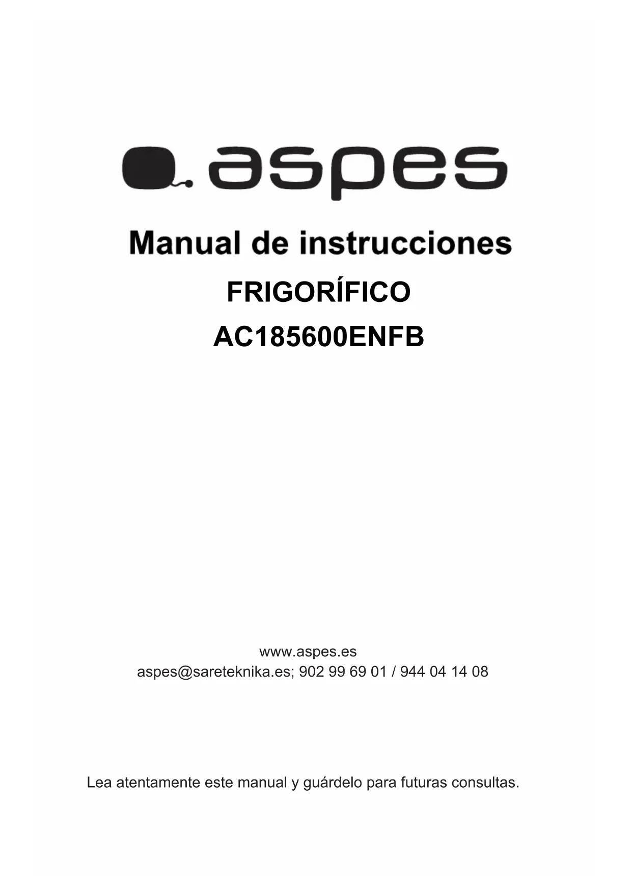 Éliminez correctement le matériau d'emballage de l’appareil. Tous les matériaux d'emballage peuvent être recyclés. Les pièces en plastique sont marquées selon les abréviations internationales standard (par exemple, PS pour polystyrène, matériau de remplissage). Cet appareil est identifié conformément à la directive européenne 2012/19/UE sur les déchets d'équipements électriques et électroniques – DEEE. Cette directive établit le cadre pour la collecte et la réutilisation des appareils usagés dans toute l’UE. Avertissement ! Les matériaux d’emballage peuvent être dangereux pour les enfants ! Pour jeter l’appareil, apportez-le à un centre de recyclage. Coupez le câble d’alimentation et laissez l’appareil inutilisable pour éviter toute réutilisation. Les emballages en carton doivent être éliminés dans les conteneurs de collecte sélective prévus à cet effet. L’élimination correcte de cet appareil permet d’éviter d’éventuels effets négatifs sur l’environnement et la santé humaine, qui pourraient être causés par une mauvaise gestion des déchets de cet appareil. Pour plus d'informations sur le recyclage de ce produit, contactez votre mairie ou le service local d’élimination des déchets. 4oLeggere attentamente questo manuale e conservarlo per consultazioni future. www.aspes.es aspes@sareteknika.es; 902 99 69 01 / 944 04 14 08 Manuale di istruzioni FRIGORIFERO AC185600ENFB1 Informazioni di sicurezza Per la vostra sicurezza e per garantire un utilizzo corretto, prima di installare e utilizzare l'apparecchio per la prima volta, leggere attentamente questo manuale d’uso, comprese le raccomandazioni e gli avvertimenti. Per evitare errori e incidenti inutili, è importante assicurarsi che tutte le persone che utilizzano l’apparecchio conoscano perfettamente il suo funzionamento e le sue caratteristiche di sicurezza. Conservare queste istruzioni e assicurarsi che accompagnino l’apparecchio in caso di spostamento o vendita, affinché chiunque lo utilizzi durante la sua vita utile sia correttamente informato sul suo uso e sulla sicurezza. Per la sicurezza delle persone e dei beni, seguire le precauzioni indicate in queste istruzioni, poiché il produttore declina ogni responsabilità per eventuali danni derivanti dalla loro inosservanza. Sicurezza dei bambini e delle persone vulnerabili