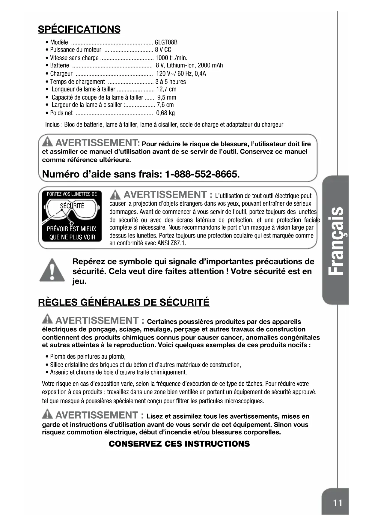 - Les outils fonctionnant sur batteries n’ayant pas besoin d’être branchés sur une prise secteur; ils sont toujours en état de fonctionnement. Tenir compte des dangers possibles lorsque l’outil n’est pas en usage et lors du remplacement des batteries. Le respect de cette règle réduira les risques d’incendie, de choc électrique et de blessures graves.Français Ensemble de coupe-herbe sans fil 8 V Manuel d’utilisation GLGT08B