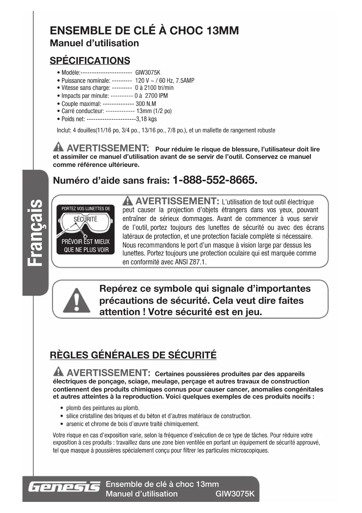 Si vous utilisez un cordon rallonge à l’extérieur, assurez-vous qu’il est marqué du suffixe « W-A» (W seulement au Canada), qui indique qu’il convient bien à une utilisation à l’extérieur.• Assurez-vous que votre cordon rallonge est correctement câblé et en bonne condition électrique. Remplacez toujours un cordon rallonge endommagé ou faites-le réparer par une personne qualifiée avant de l’utiliser. • Protégez vos cordons rallonges des angles et objets tranchants, de la chaleur excessive, et des zones humides ou mouillées. Calibre de fil minimum recommandé pour cordons de rallonge (en 120 Volts)Ampérage nominal (à pleine charge)Longueur du cordon de rallonge7.6 m25 Feet15.2 m50 Feet22.9 m75 Feet30.5 m100 Feet45.7 m150 Feet61.0 m200 Feet0–2.0 18 18 18 18 16 162.1–3.4 18 18 18 16 14 143.5–5.0 18 18 16 14 12 125.1–7.0 18 16 14 12 12 107.1–12.0 18 14 12 10 8 8 12.1–16.0 14 12 10 10 8 6 16.1–20.0 12 10 8 8 6 6Français Ensemble de clé à choc 13mm Manuel d’utilisation GIW3075K RÈGLES DE SÉCURITÉ SPÉCIFIQUES POUR