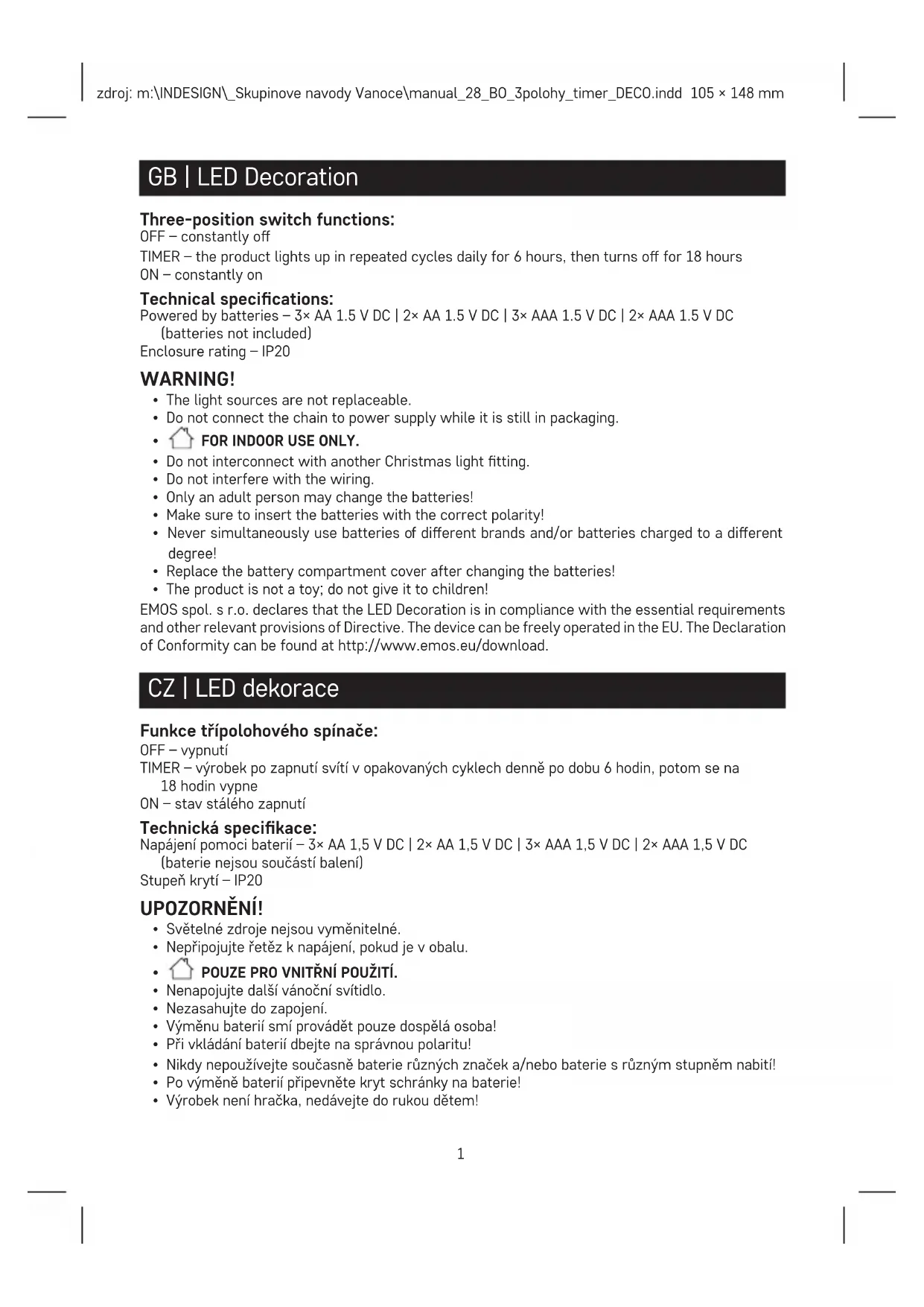 - Le produit n‘est pas un jouet ; ne le mettez pas entre les mains des enfants ! EMOS spol. s r. o. déclare que les LED Décoratives est en conformité avec les essentiels exigences et autres pertinentes dispositions de la directive. L‘ appareil peut être utilisé librement dans l‘ UE. La déclaration de conformité peut être trouvé à http://www.emos.eu/download. IT | Decorazione LED Funzioni dell‘interruttore a tre posizioni: OFF – costantemente spento TIMER – il prodotto si accende a cicli ripetuti giornalmente per 6 ore, quindi si spegne per 18 ore ON – costantemente acceso Speciche tecniche: Alimentazione a batterie – 3× AA 1,5 V DC | 2× AA 1,5 V DC | 3× AAA 1,5 V DC | 2× AAA 1,5 V DC (batterie non incluse) Grado di protezione – IP20 ATTENZIONE!