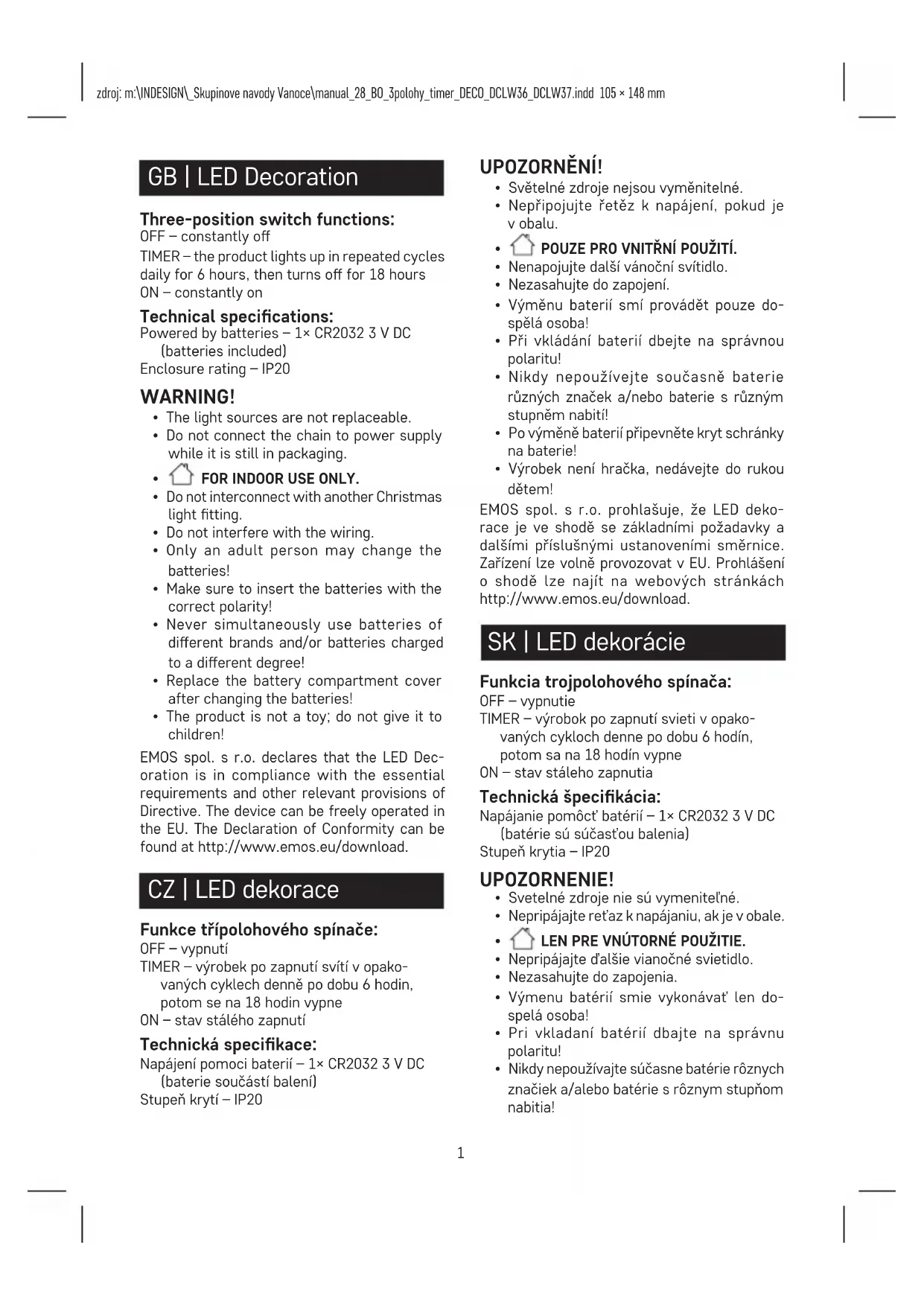 - Le produit n‘est pas un jouet ; ne le mettez pas entre les mains des enfants ! EMOS spol. s r. o. déclare que les LED Déco- ratives est en conformité avec les essentiels exigences et autres pertinentes dispositions de la directive. L‘ appareil peut être utilisé librement dans l‘ UE. La déclaration de conformité peut être trouvé à http://www.emos.eu/download. IT | Decorazione LED Funzioni dell‘interruttore a tre posizioni: OFF – costantemente spento TIMER – il prodotto si accende a cicli ripetuti giornalmente per 6 ore, quindi si spegne per 18 ore ON – costantemente acceso7 Speciche tecniche: Alimentazione a batterie – 1× CR2032 3 V DC (batterie incluse) Grado di protezione – IP20 ATTENZIONE!