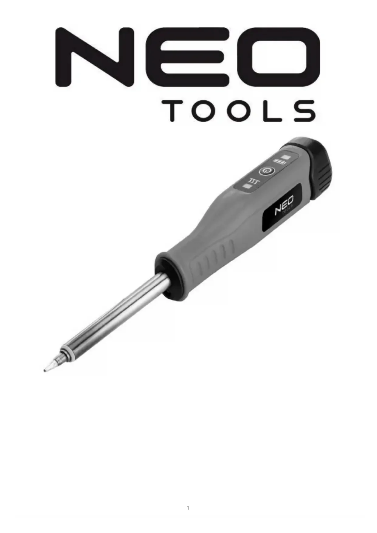 Les produits fonctionnant à l'électricité ne doivent pas être jetés avec les déchets ménagers, mais doivent être apportés dans des installations appropriées pour être éliminés. Contactez le revendeur de votre produit ou les autorités locales pour obtenir des informations sur l'élimination. Les déchets d'équipements électriques et électroniques contiennent des substances qui ne sont pas respectueuses de l'environnement. Les équipements qui ne sont pas recyclés présentent un risque potentiel pour l'environnement et la santé humaine. "Grupa Topex Spółka z ograniczoną odpowiedzialnością" Spółka komandytowa dont le siège social est situé à Varsovie, ul. Pograniczna 2/4 (ci-après : "Grupa Topex") informe que tous les droits d'auteur sur le contenu de ce manuel (ci-après : "Manuel"), y compris, entre autres. Son texte, ses photographies, ses diagrammes, ses dessins, ainsi que sa composition, appartiennent exclusivement à Grupa Topex et font l'objet d'une protection légale en vertu de la loi du 4 février 1994 sur le droit d'auteur et les droits connexes (ie Journal des lois 2006 n° 90 Poz. 631, tel que modifié). La copie, le traitement, la publication, la modification à des fins commerciales de l'ensemble du Manuel et de ses éléments individuels, sans le consentement de Grupa Topex exprimé par écrit, est strictement interdite et peut entraîner une responsabilité civile et pénale. Déclaration de conformité de l'UE Fabricant : Grupa Topex Sp. z o.o. Sp.k., Pograniczna 2/4 02-285 Warszawa Produit : Fer à souder sans fil Modèle : 19-250 Nom commercial : NEO TOOLS Numéro de série : 00001 ÷ 99999 Cette déclaration de conformité est délivrée sous la seule responsabilité du fabricant. Le produit décrit ci-dessus est conforme aux documents suivants : Directive sur la compatibilité électromagnétique 2014/30/EU Directive RoHS 2011/65/EU modifiée par la directive 2015/863/EU Et répond aux exigences des normes : EN IEC 55014-1:2021 ; EN IEC 55014-2:2021 ; EN IEC 61000-3- 2:2019+A1:2021 ; EN 61000-3-3:2013+A1:2019 ; EN IEC 63000:2018 Cette déclaration concerne uniquement la machine telle qu'elle est mise sur le marché et n'inclut pas les composants. ajoutés par l'utilisateur final ou réalisés par lui ultérieurement. Nom et adresse de la personne résidente de l'UE autorisée à préparer le dossier technique : Signé au nom de : Grupa Topex Sp. z o.o. Sp.k. 2/4, rue Pograniczna 02-285 Varsovie Paweł Kowalski TOPEX GROUP Responsable de la qualité Varsovie, 2022-11-04