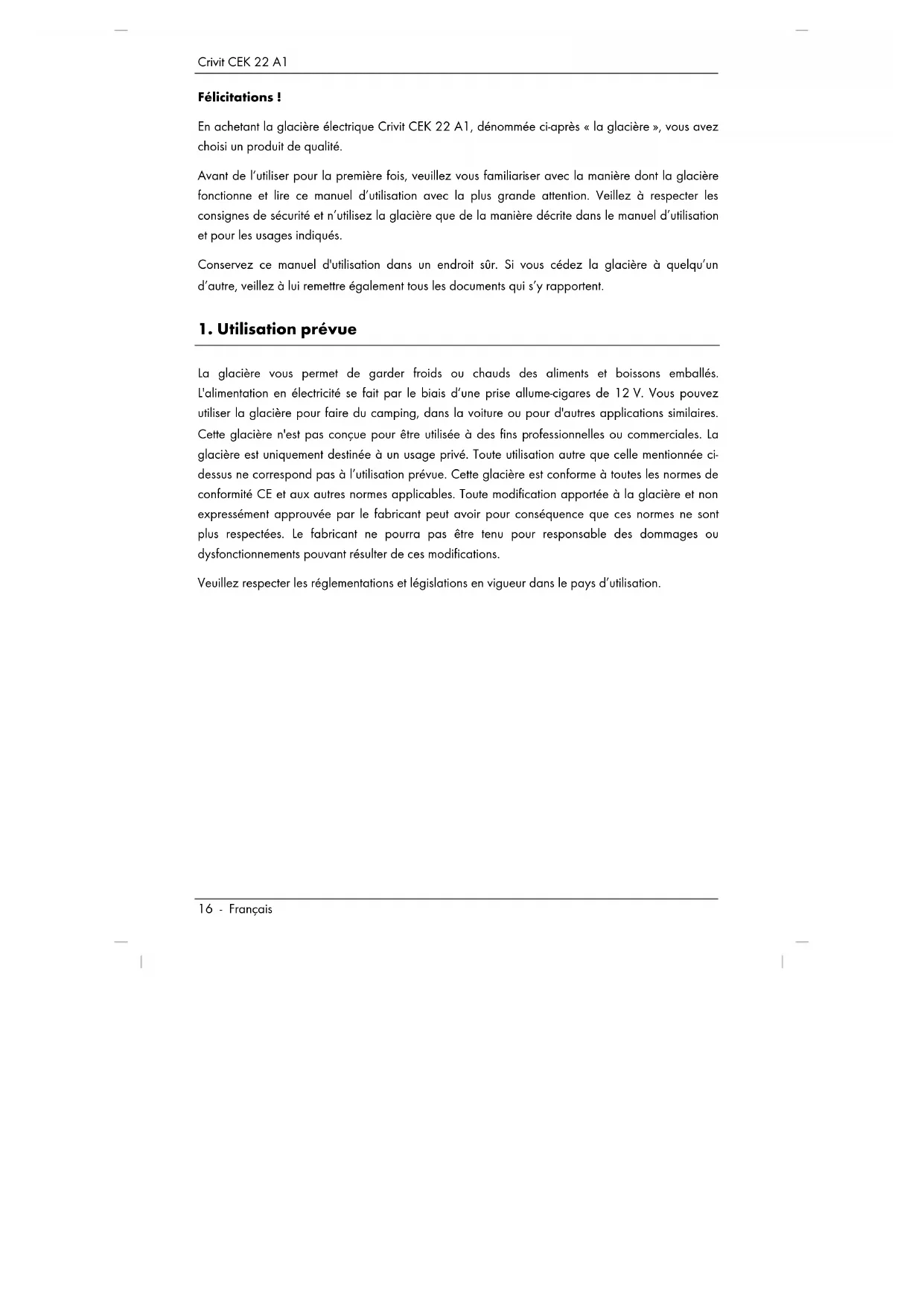 La glacière vous permet de garder froids ou chauds des aliments et boissons emballés. L'alimentation en électricité se fait par le biais d’une prise allume-cigares de 12 V. Vous pouvez utiliser la glacière pour faire du camping, dans la voiture ou pour d'autres applications similaires. Cette glacière n'est pas conçue pour être utilisée à des fins professionnelles ou commerciales. La glacière est uniquement destinée à un usage privé. Toute utilisation autre que celle mentionnée ci- dessus ne correspond pas à l’utilisation prévue. Cette glacière est conforme à toutes les normes de conformité CE et aux autres normes applicables. Toute modification apportée à la glacière et non expressément approuvée par le fabricant peut avoir pour conséquence que ces normes ne sont plus respectées. Le fabricant ne pourra pas être tenu pour responsable des dommages ou dysfonctionnements pouvant résulter de ces modifications. Veuillez respecter les réglementations et législations en vigueur dans le pays d’utilisation.Crivit CEK 22 A1 Français - 17