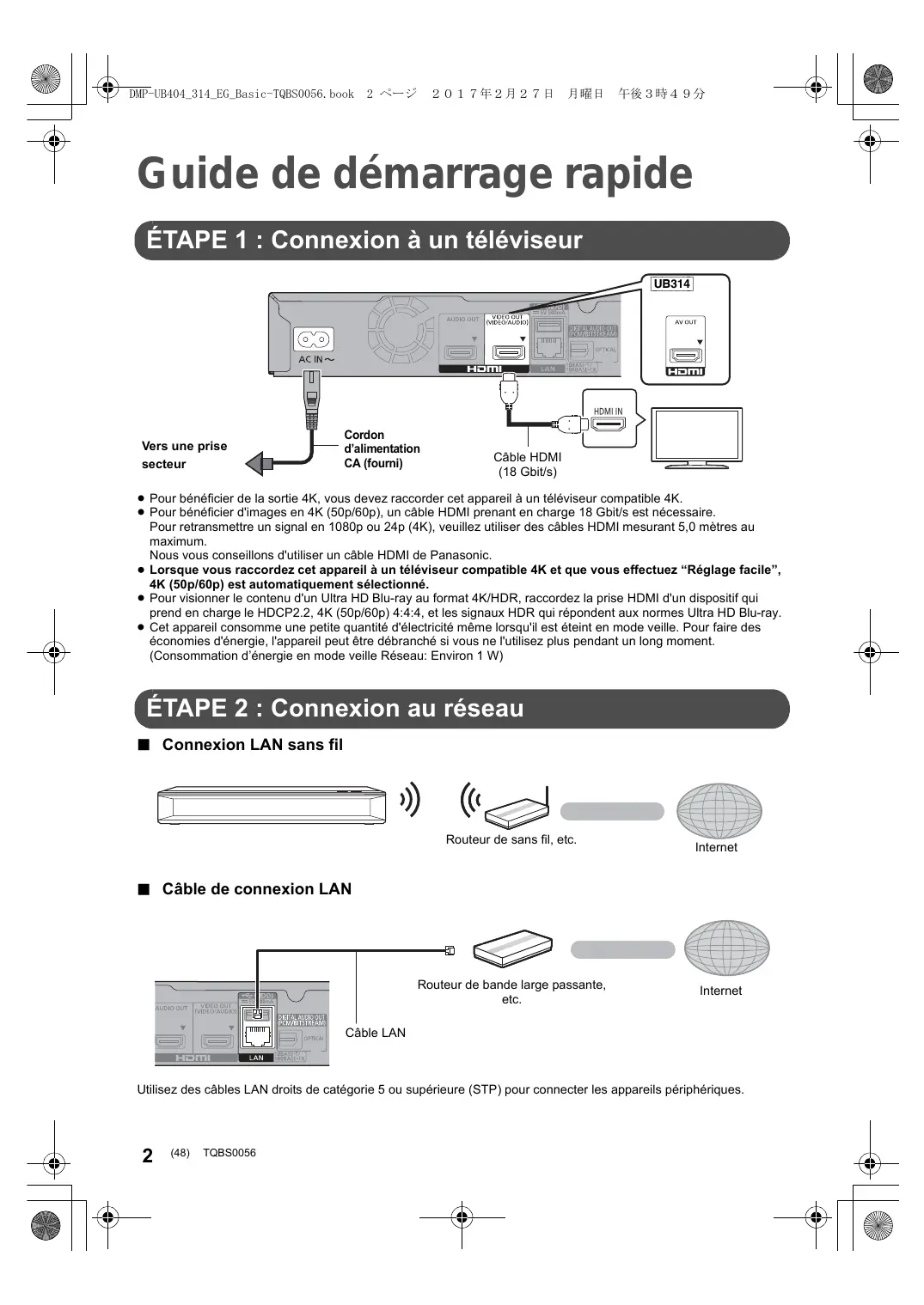 Nous vous conseillons d'utiliser un câble HDMI de Panasonic. ≥ Lorsque vous raccordez cet appareil à un téléviseur compatible 4K et que vous effectuez “Réglage facile”, 4K (50p/60p) est automatiquement sélectionné. ≥ Pour visionner le contenu d'un Ultra HD Blu-ray au format 4K/HDR, raccordez la prise HDMI d'un dispositif qui prend en charge le HDCP2.2, 4K (50p/60p) 4:4:4, et les signaux HDR qui répondent aux normes Ultra HD Blu-ray. ≥ Cet appareil consomme une petite quantité d'électricité même lorsqu'il est éteint en mode veille. Pour faire des économies d'énergie, l'appareil peut être débranché si vous ne l'utilisez plus pendant un long moment. (Consommation d’énergie en mode veille Réseau: Environ 1 W)
