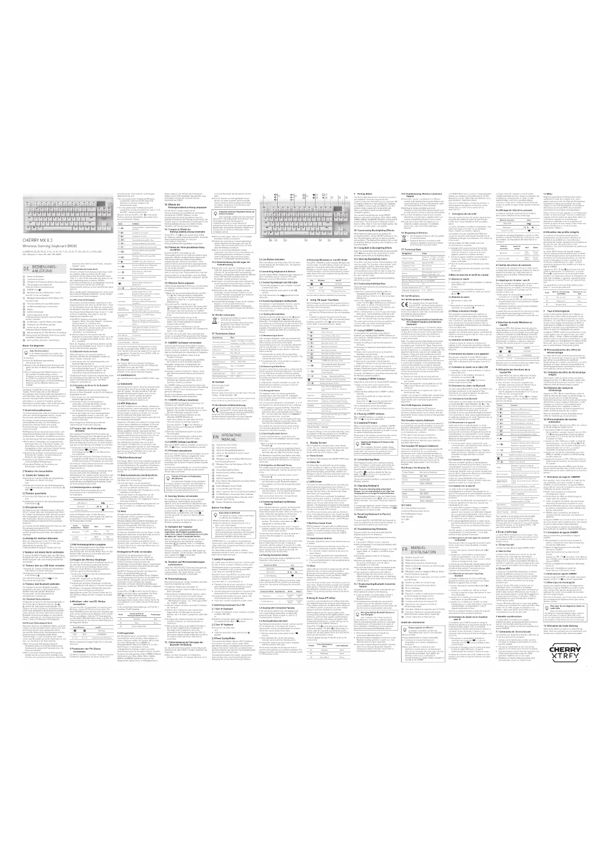 ① Modifier le profil actif ② Régler le volume sonore ③ Régler la luminosité du rétroéclairage ④ Régler la vitesse de transition du rétroéclairage ⑤ Touche CHERRY ( ) ⑥ (Windows) Lancer le navigateur Web par défaut (macOS) Recherche Spotlight ⑦ (Windows) Ouvrir l’explorateur de fichiers (ce PC) (macOS) Finder ⑧ Modifier les effets de rétroéclairage ⑨ Restaurer les paramètres par défaut ⑩ Écran d’affichage ⑪ Molette multifonction ⑫ Démarrer / quitter le mode de personnalisation du rétroéclairage de chaque touche ⑬ Passer en mode Windows / macOS ⑭ Accéder aux fonctions de la touche FN ⑮ Sélectionner les couleurs du mode de rétroéclairage actuel ⑯ Indicateur d’état de la connexion sans fil 2,4 GHz ⑰ Indicateur d’état de la connexion Bluetooth, sélectionner les canaux, lancer l’appairage ⑱ Activer / désactiver le mode Gaming Avant de commencer Designation Value Supply VoltageKeyboard: 5.0 V/DC ± 5% SELVReceiver: 5.0 V/DC ± 5% SELVCharging Voltage Typical 5.0 V/DCCharging Current Max. 400 mACurrent Consumption Max. 500 mABatteryRechargeable Lithium-ion Battery, 4600 mAh, 3.6VOperating Frequency 2400.0 … 2483.5 MHzEffective Radiated Power Max. 10 mW (EIRP)Bluetooth 5.3Storage Temperature -20 °C … +60 °COperating Temperature 0 °C … +50 °C Product Name Mechanical Keyboard Model G80-3883