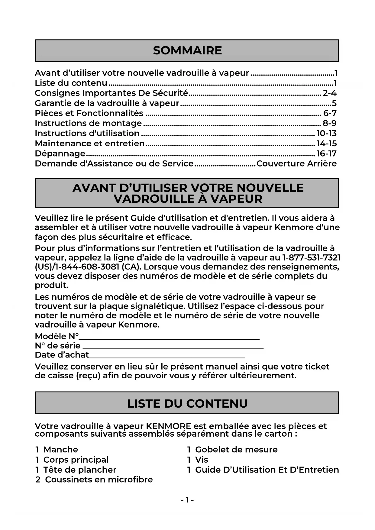 Votre vadrouille à vapeur KENMORE est emballée avec les pièces et composants suivants assemblés séparément dans le carton : 1 Manche 1 Corps principal 1 Tête de plancher 2 Coussinets en microbre Veuillez lire le présent Guide d'utilisation et d'entretien. Il vous aidera à assembler et à utiliser votre nouvelle vadrouille à vapeur Kenmore d’une façon des plus sécuritaire et efcace. Pour plus d’informations sur l’entretien et l’utilisation de la vadrouille à vapeur, appelez la ligne d’aide de la vadrouille à vapeur au 1-877-531-7321 (US)/1-844-608-3081 (CA). Lorsque vous demandez des renseignements, vous devez disposer des numéros de modèle et de série complets du produit. Les numéros de modèle et de série de votre vadrouille à vapeur se trouvent sur la plaque signalétique. Utilisez l’espace ci-dessous pour noter le numéro de modèle et le numéro de série de votre nouvelle vadrouille à vapeur Kenmore. Modèle N°____________________________________________ N° de série ____________________________________________ Date d’achat______________________________________ Veuillez conserver en lieu sûr le présent manuel ainsi que votre ticket de caisse (reçu) an de pouvoir vous y référer ultérieurement.