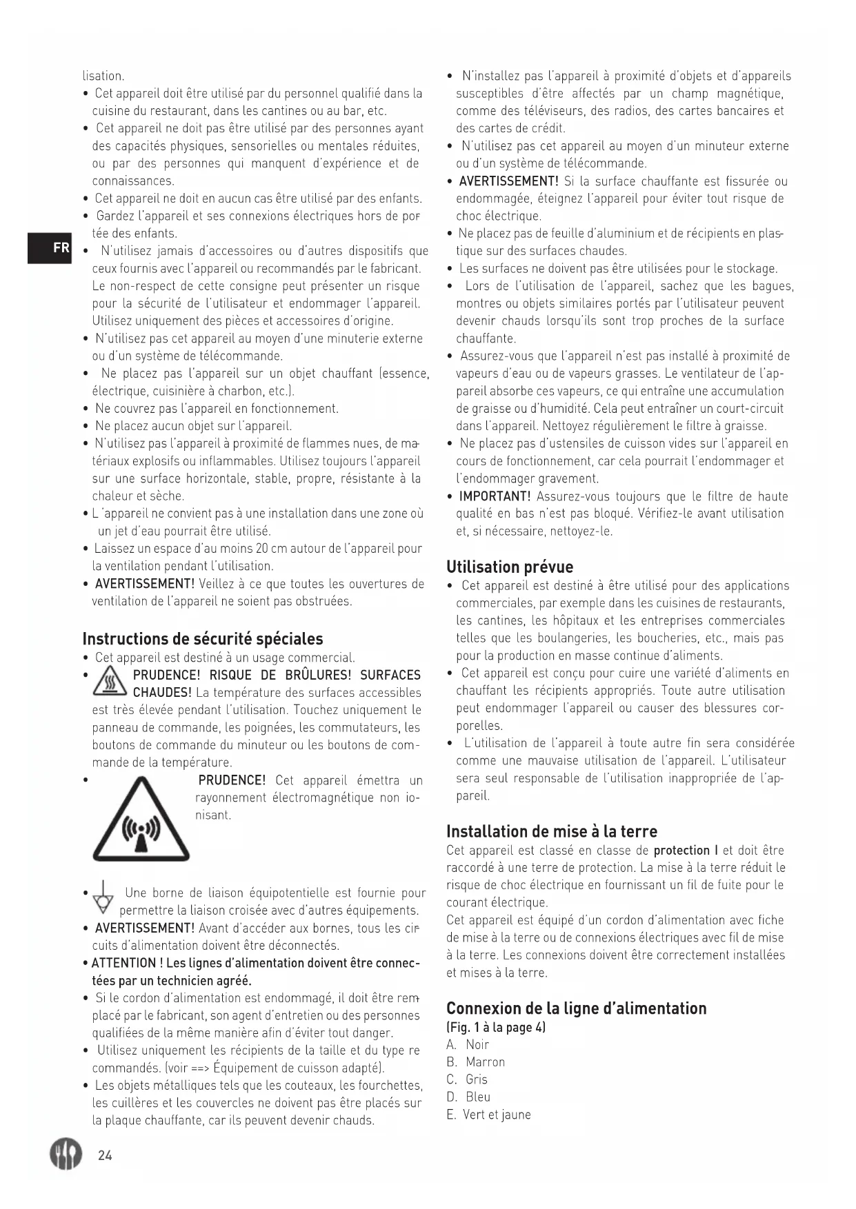 pareil. Installation de mise à la terre Cet appareil est classé en classe de protection I et doit être raccordé à une terre de protection. La mise à la terre réduit le risque de choc électrique en fournissant un fil de fuite pour le courant électrique. Cet appareil est équipé d’un cordon d’alimentation avec fiche de mise à la terre ou de connexions électriques avec fil de mise à la terre. Les connexions doivent être correctement installées et mises à la terre. Connexion de la ligne d’alimentation (Fig. 1 à la page 4) A. Noir B. Marron C. Gris D. Bleu E. Vert et jaune25