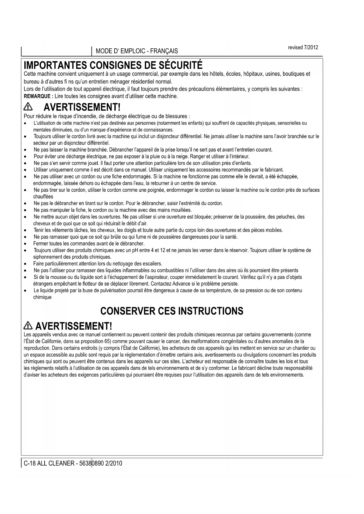 INSTRUCCIONES DE USOB - ESPAÑOLIMPORTANTES CONSIGNES DE SÉCURITÉ Cette machine convient uniquement à un usage commercial, par exemple dans les hôtels, écoles, hôpitaux, usines, boutiques et bureau à d’autres fi ns qu’un entretien ménager résidentiel normal. Lors de l’utilisation de tout appareil électrique, il faut toujours prendre des précautions élémentaires, y compris les suivantes : REMARQUE : Lire toutes les consignes avant d’utiliser cette machine. AVERTISSEMENT! Pour réduire le risque d’incendie, de décharge électrique ou de blessures : L’utilisation de cette machine n’est pas destinée aux personnes (notamment les enfants) qui souffrent de capacités physiques, sensorielles ou mentales diminuées, ou d’un manque d’expérience et de connaissances. Toujours utiliser le cordon livré avec la machine qui inclut un disjoncteur différentiel. Ne jamais utiliser la machine sans l’avoir branchée sur le secteur par un disjoncteur différentiel. Ne pas laisser la machine branchée. Débrancher l’appareil de la prise lorsqu’il ne sert pas et avant l’entretien courant. Pour éviter une décharge électrique, ne pas exposer à la pluie ou à la neige. Ranger et utiliser à l’intérieur. Ne pas s’en servir comme jouet. Il faut porter une attention particulière lors de son utilisation près d’enfants. Utiliser uniquement comme il est décrit dans ce manuel. Utiliser uniquement les accessoires recommandés par le fabricant. Ne pas utiliser avec un cordon ou une fi che endommagés. Si la machine ne fonctionne pas comme elle le devrait, a été échappée, endommagée, laissée dehors ou échappée dans l’eau, la retourner à un centre de service. Ne pas tirer sur le cordon, utiliser le cordon comme une poignée, endommager le cordon ou laisser la machine ou le cordon près de surfaces chauffées Ne pas le débrancher en tirant sur le cordon. Pour le débrancher, saisir l’extrémité du cordon. Ne pas manipuler la fi che, le cordon ou la machine avec des mains mouillées. Ne mettre aucun objet dans les ouvertures. Ne pas utiliser si une ouverture est bloquée; préserver de la poussière, des peluches, des cheveux et de quoi que ce soit qui réduirait le débit d’air. Tenir les vêtements lâches, les cheveux, les doigts et toute autre partie du corps loin des ouvertures et des pièces mobiles. Ne pas ramasser quoi que ce soit qui brûle ou qui fume ni de poussières dangereuses pour la santé. Fermer toutes les commandes avant de le débrancher. Toujours utiliser des produits chimiques avec un pH entre 4 et 12 et ne jamais les verser dans le réservoir. Toujours utiliser le système de siphonnement des produits chimiques. Faire particulièrement attention lors du nettoyage des escaliers. Ne pas l’utiliser pour ramasser des liquides infl ammables ou combustibles ni l’utiliser dans des aires où ils pourraient être présents Si de la mousse ou du liquide sort à l’échappement de l’aspirateur, couper immédiatement le courant. Vérifi ez qu’il n’y a pas d’objets étrangers empêchant le fl otteur de se déplacer librement. Contactez Advance si le problème persiste. Le liquide projeté par la buse de pulvérisation pourrait être dangereux à cause de sa température, de sa pression ou de son contenu chimique