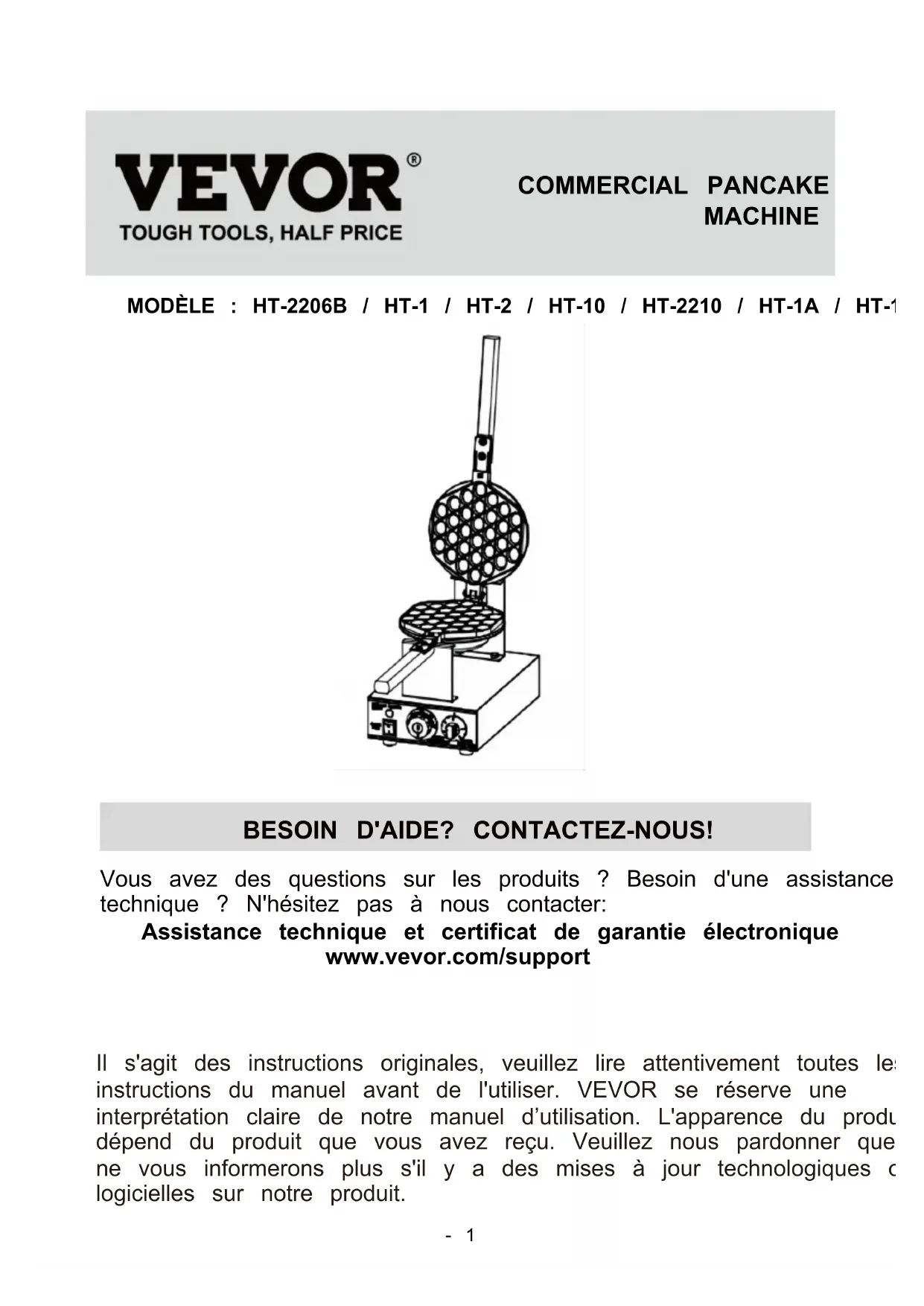 MACHINE MODÈLE : HT-2206B/HT-1/HT-2/HT-10. HT-2210 / HT-1A / HT-119 We continue to be committed to provide you tools with competitive price. "Save Half", "Half Price" or any other similar expressions used by us only represents an estimate of savings you might benefit from buying certain tools with us compared to the major top brands and does not necessarily mean to cover all categories of tools offered by us. You are kindly reminded to verify carefully when you are placing an order with us if you are actually saving half in comparison with the top major brands.- 4 -- 1 - MODÈLE : HT-2206B / HT-1 / HT-2 / HT-10 / HT-2210 / HT-1A / HT-119 BESOIN D'AIDE? CONTACTEZ-NOUS! Vous avez des questions sur les produits ? Besoin d'une assistance technique ? N'hésitez pas à nous contacter: Assistance technique et certificat de garantie électronique www.vevor.com/support Il s'agit des instructions originales, veuillez lire attentivement toutes les instructions du manuel avant de l'utiliser. VEVOR se réserve une interprétation claire de notre manuel d’utilisation. L'apparence du produit dépend du produit que vous avez reçu. Veuillez nous pardonner que nous ne vous informerons plus s'il y a des mises à jour technologiques ou logicielles sur notre produit. COMMERCIAL PANCAKE MACHINE- 2 -