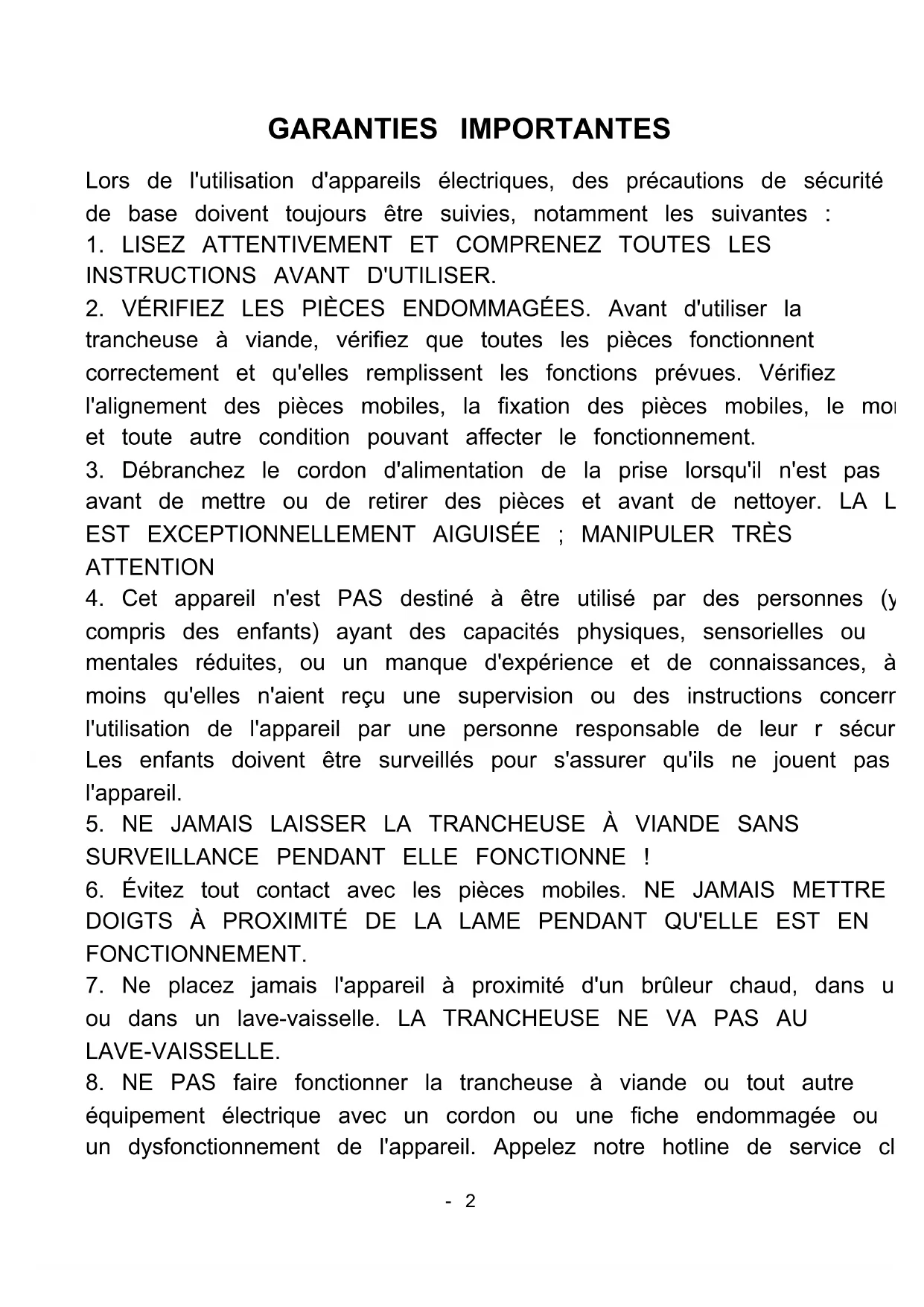 - NE JAMAIS LAISSER LA TRANCHEUSE À VIANDE SANS SURVEILLANCE PENDANT QU'ELLE FONCTIONNE!