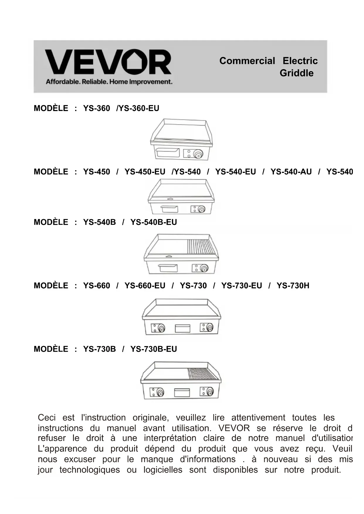 YS540EU - Plaque de grill Vevor - Notice d'utilisation et mode d'emploi gratuit