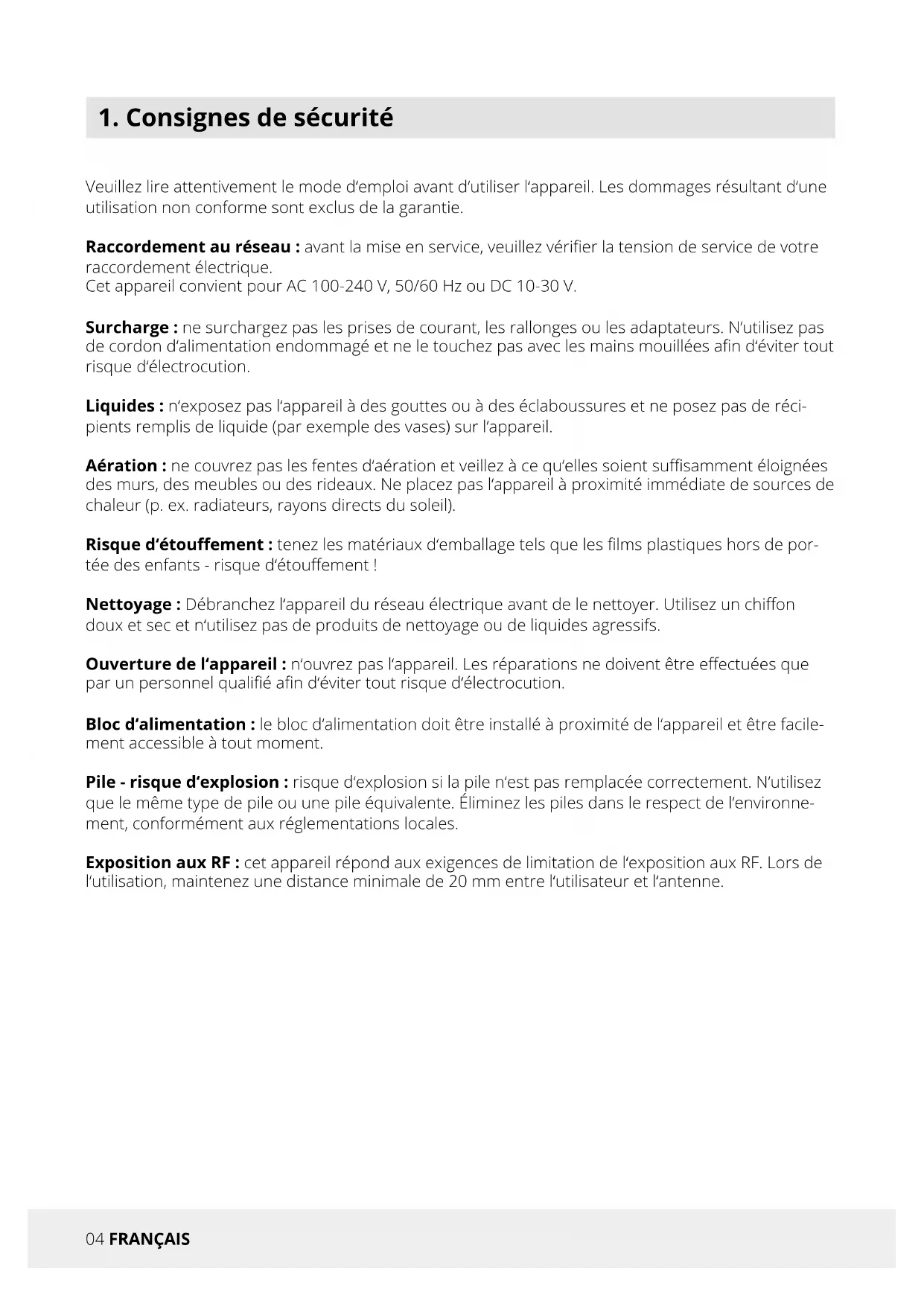 9.3 Lire des médias via USB .......................................................................................... 34 10. Dépannage .................................................................................................................... 35 11. Détails techniques .................................................................................................... 3604 FRANÇAIS Veuillez lire attentivement le mode d‘emploi avant d‘utiliser l‘appareil. Les dommages résultant d‘une utilisation non conforme sont exclus de la garantie. Raccordement au réseau : avant la mise en service, veuillez vérier la tension de service de votre raccordement électrique. Cet appareil convient pour AC 100-240 V, 50/60 Hz ou DC 10-30 V. Surcharge : ne surchargez pas les prises de courant, les rallonges ou les adaptateurs. N‘utilisez pas de cordon d‘alimentation endommagé et ne le touchez pas avec les mains mouillées an d‘éviter tout risque d‘électrocution. Liquides : n‘exposez pas l‘appareil à des gouttes ou à des éclaboussures et ne posez pas de réci- pients remplis de liquide (par exemple des vases) sur l‘appareil. Aération : ne couvrez pas les fentes d‘aération et veillez à ce qu‘elles soient susamment éloignées des murs, des meubles ou des rideaux. Ne placez pas l‘appareil à proximité immédiate de sources de chaleur (p. ex. radiateurs, rayons directs du soleil). Risque d‘étouement : tenez les matériaux d‘emballage tels que les lms plastiques hors de por- tée des enfants - risque d‘étouement ! Nettoyage : Débranchez l‘appareil du réseau électrique avant de le nettoyer. Utilisez un chion doux et sec et n‘utilisez pas de produits de nettoyage ou de liquides agressifs. Ouverture de l‘appareil : n‘ouvrez pas l‘appareil. Les réparations ne doivent être eectuées que par un personnel qualié an d‘éviter tout risque d‘électrocution. Bloc d‘alimentation : le bloc d‘alimentation doit être installé à proximité de l‘appareil et être facile- ment accessible à tout moment. Pile - risque d‘explosion : risque d‘explosion si la pile n‘est pas remplacée correctement. N‘utilisez que le même type de pile ou une pile équivalente. Éliminez les piles dans le respect de l‘environne- ment, conformément aux réglementations locales. Exposition aux RF : cet appareil répond aux exigences de limitation de l‘exposition aux RF. Lors de l‘utilisation, maintenez une distance minimale de 20 mm entre l‘utilisateur et l‘antenne.