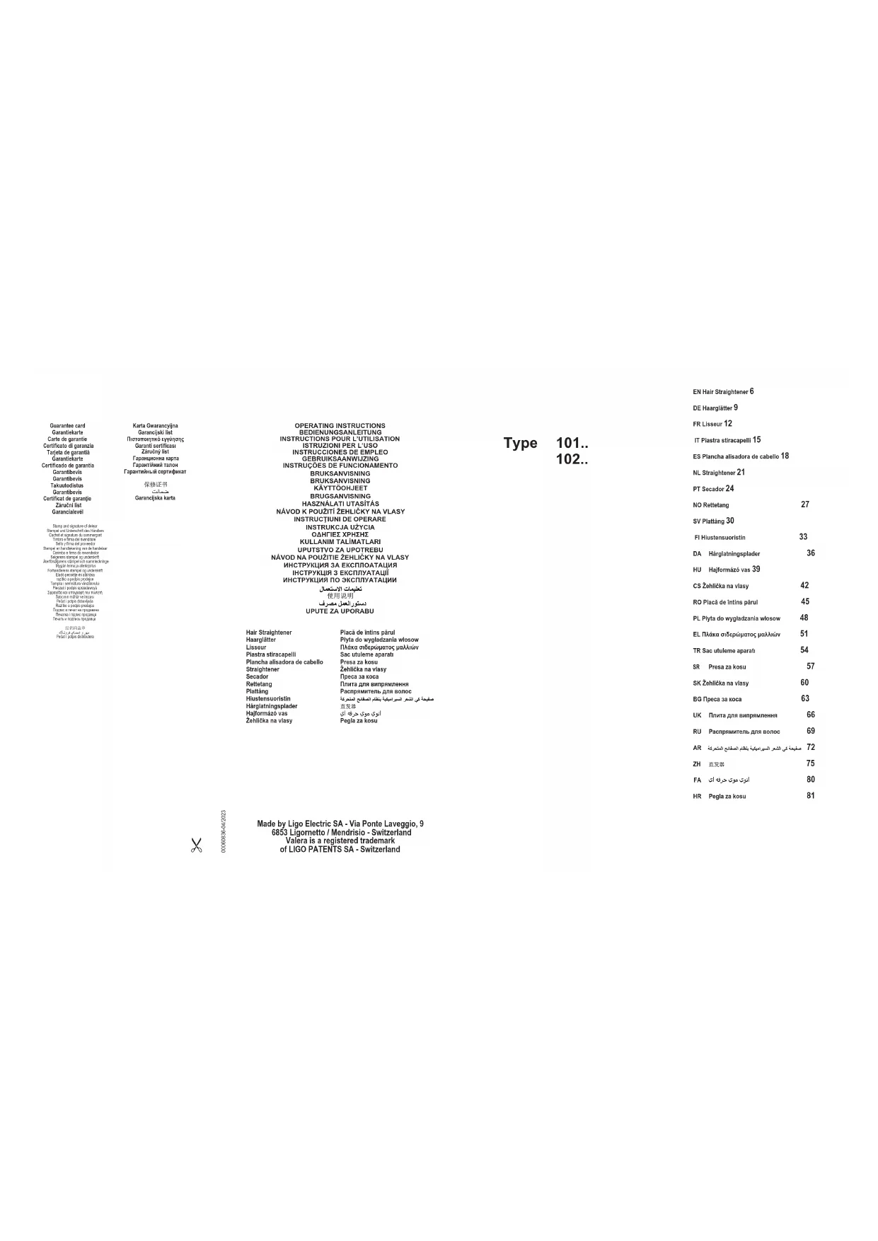 Le symbole sur le produit ou son emballage indique que ce produit ne peut être traité comme déchet ménager. Il doit être remis au point de collecte prévu à cet effet (collecte et recyclage du matériel électrique et électronique). En procédant à la mise à la casse réglementaire de l’appareil, nous préservons l’environnement et notre sécurité, s’assurant ainsi que le déchets seront traités dans des conditions appropriées. Pour obtenir plus de détails sur le recyclage de ce produit, veuillez prendre contact avec les services de votre commune ou le magasin où vous avez effectué l’achat. VALERA est une marque enregistrée par LIGO PATENTS SA - Suisse 00060836 int 2023_04_Layout 1 05/04/2023 12:12 Pagina 1415 Italiano ISTRUZIONI PER L’USO - Istruzioni originali Modelli 101.20, 101.20/I, 101.03, 101.03/I, 101.04, 101.04/I, 101.30, 101.30/I, 101.31, 101.31/I, 101.32, 101.32/I, 101.33, 101.33/I, 101.34, 101.34/I, 101.35, 101.35/I, 102.03, 102.04 Leggere attentamente queste istruzioni prima di utilizzare l’apparecchio - Disponibili anche su www.valera.com
