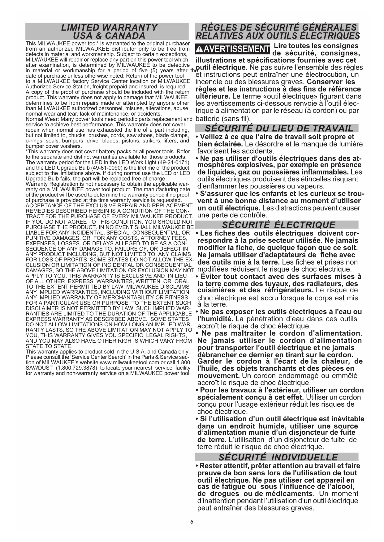 Cet outil électrique MILWAUKEE* est garanti à l’acheteur d’origine uniquement par un distributeur agréé de MILWAUKEE d’être exempt de vice du matériau et de fabrication. Sous réserve de certaines exceptions, MILWAUKEE réparera ou remplacera toute pièce de cet outil électrique qui, après examen par MILWAUKEE, est aectée d’un vice de matériau ou de fabrication pendant une période de cinq (5) ans après la date d’achat, sauf indication contraire. Il faudra retourner l’outil électrique à un centre de service en usine MILWAUKEE ou à un poste d’entretien agréé MILWAUKEE, en port prépayé et assuré. Une copie de la preuve d’achat doit être présentée lors du retour du produit. Cette garantie ne couvre pas les dommages que MILWAUKEE détermine d’être causés par des réparations ou des tentatives de réparation par quiconque d’autre que le personnel agréé par MILWAUKEE, des utilisations incorrectes, des altérations, des utilisations abusives, une usure normale, une carence d’entretien ou les accidents. Usure normale : Par rapport à plusieurs outils électriques, il faut remplacer et entretenir leurs pièces an de jouir de leur rendement optimal. Cette garantie ne couvre pas les cas de réparation lorsque la vie utile normale de la pièce s’est terminée, incluant, sans s’y limiter, les mandrins, les balais, les câbles, les patins de scie, les brides de lame, les joints toriques, les embouts, les butoirs, les lames d’entraînement, les pistons, les percuteurs, les poussoirs et les rondelles de protec- tion de butoir. *Cette garantie ne couvre ni les blocs-piles ni tous les outils électriques. Veuillez vous reporter aux autres garanties diérentes disponibles pour ces produits. La période durant lequel la garantie est valable pour la lumière à DEL de la lampe de travail à DEL (49-24-0171) et l’ampoule transformée à DEL (49-81-0090) est d’une durée égale à la vie utile du produit en raison des limites au-dessus. Si la lumière à DEL ou l’ampoule transformée à DEL tombent en panne durant l’utilisation normale, la pièce sera remplacée gratuitement. L’inscription de la garantie n’est pas nécessaire pour bénécier de la garantie en vigueur d’un outil électrique MILWAUKEE. La date de fabrication du produit servira à établir la période de garantie si aucune preuve d’achat n’est fournie lorsqu’une demande de service sous garantie est faite. L’ACCEPTATION DES RECOURS EXCLUSIFS DE RÉPARATION ET DE REMPLACEMENT DÉCRITS PAR LA PRÉSENTE EST UNE CON- DITION DU CONTRAT D’ACHAT DE TOUT PRODUIT MILWAUKEE. SI VOUS N’ACCEPTEZ PAS CETTE CONDITION, VOUS NE DEVEZ PAS ACHETER LE PRODUIT. EN AUCUN CAS MILWAUKEE NE SAURAIT ÊTRE RESPONSABLE DE TOUT DOMMAGE ACCES- SOIRE, SPÉCIAL OU INDIRECT, DE DOMMAGES-INTÉRÊTS PUNITIFS OU DE TOUTE DÉPENSE, D’HONORAIRES D’AVOCATS, DE FRAIS, DE PERTE OU DE DÉLAIS ACCESSOIRES À TOUT DOMMAGE, DÉFAILLANCE OU DÉFAUT DE TOUT PRODUIT, Y COMPRIS NOTAMMENT LES PERTES DE PROFIT. CERTAINS ÉTATS ET PROVINCES NE PERMETTANT L'EXCLUSION OU LA LIMITATION DES DOMMAGES DIRECTS OU INDIRECTS, LES RESTRICTIONS CI-DESSOUS PEUVENT NE PAS ÊTRE APPLI- CABLES. CETTE GARANTIE EST EXCLUSIVE ET REMPLACE TOUTE AUTRE GARANTIE EXPRESSE, QU’ELLE SOIT VERBALE OU ÉCRITE. DANS LA MESURE PERMISE PAR LA LOI, MILWAUKEE RENONCE À TOUTE GARANTIE IMPLICITE, Y COMPRIS, SANS S’Y LIMITER, TOUTE GARANTIE IMPLICITE DE COMMERCIA- BILITÉ OU D’ADAPTATION À UNE UTILISATION OU À UNE FIN PARTICULIÈRE. DANS LA MESURE OÙ UNE TELLE STIPULATION D’EXONÉRATION N’EST PAS PERMISE PAR LA LOI, LA DURÉE DE CES GARANTIES IMPLICITES EST LIMITÉE À LA PÉRIODE APPLICABLE DE LA GARANTIE EXPRESSE, TELLE QUE CELA EST DÉCRIT PRÉCÉDEMMENT. CERTAINES PROVINCES NE PERMETTANT PAS DE LIMITATION DE DURÉE DES GARANTIES IMPLICITES, LES RESTRICTIONS CI-DESSUS PEUVENT NE PAS ÊTRE APPLICABLES. LA PRÉSENTE CONFÈRE À L’UTILISATEUR DES DROITS LÉGAUX PARTICULIERS ; IL BÉNÉFICIE ÉGALEMENT D’AUTRES DROITS QUI VARIENT D’UNE PROVINCE À L’AUTRE. Cette garantie s’applique uniquement aux produits vendus aux États- Unis et au Canada. Veuillez consulter l’onglet « Trouver un centre Service », dans la section « Pièces et service » du site web de MILWAUKEE, à l’adresse www.milwaukeetool.com, ou composer le 1.800.SAWDUST (1.800.729.3878) an de trouver le centre de service le plus proche dans votre région pour l’entretien, sous garantie ou non, de votre outil électrique MILWAUKEE.