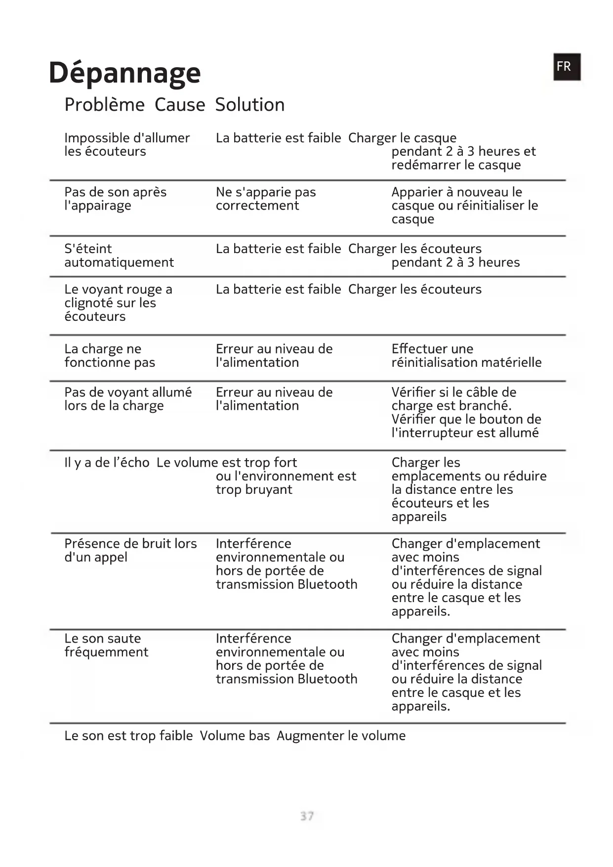 FRProblème Cause Solution Dépannage Impossible d'allumer les écouteurs La batterie est faible Charger le casque pendant 2 à 3 heures et redémarrer le casque Pas de son après l'appairage Ne s'apparie pas correctement Apparier à nouveau le casque ou réinitialiser le casque S'éteint automatiquement La batterie est faible Charger les écouteurs pendant 2 à 3 heures Le voyant rouge a clignoté sur les écouteurs La batterie est faible Charger les écouteurs Le son est trop faible Volume bas Augmenter le volume La charge ne fonctionne pas Erreur au niveau de l'alimentation Effectuer une réinitialisation matérielle Pas de voyant allumé lors de la charge Erreur au niveau de l'alimentation Vérier si le câble de charge est branché. Vérier que le bouton de l'interrupteur est allumé Il y a de l’écho Le volume est trop fort ou l'environnement est trop bruyant Charger les emplacements ou réduire la distance entre les écouteurs et les appareils Le son saute fréquemment Interférence environnementale ou hors de portée de transmission Bluetooth Changer d'emplacement avec moins d'interférences de signal ou réduire la distance entre le casque et les appareils. Présence de bruit lors d'un appel Interférence environnementale ou hors de portée de transmission Bluetooth Changer d'emplacement avec moins d'interférences de signal ou réduire la distance entre le casque et les appareils.