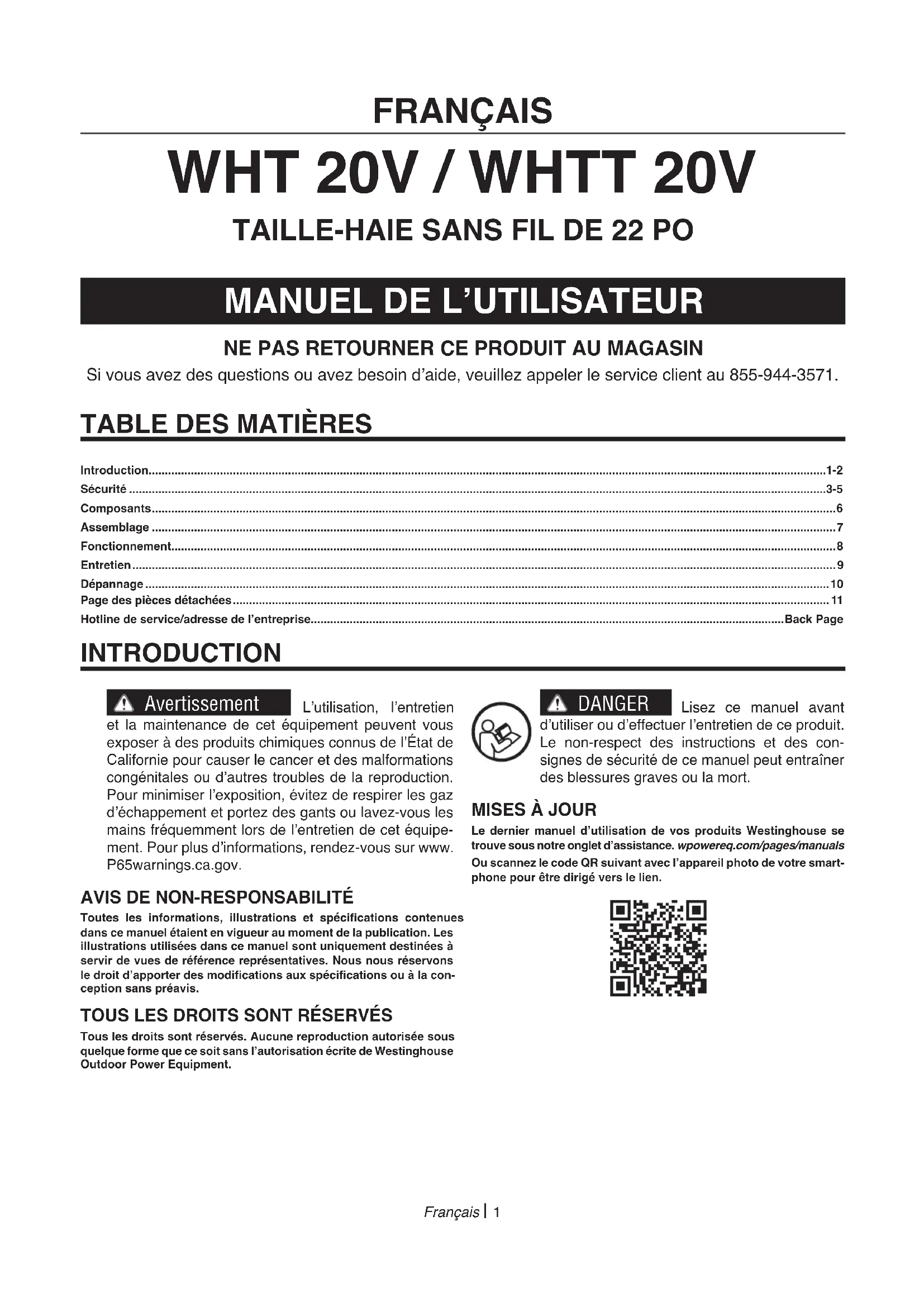 Introduction .................................................................................................................................................................................................................1-2 Sécurité .......................................................................................................................................................................................................................3-5 Composants ................................................................................................................................................................................................................... 6 Assemblage ...................................................................................................................................................................................................................7 Fonctionnement .............................................................................................................................................................................................................8 Entretien ......................................................................................................................................................................................................................... 9 Dépannage ...................................................................................................................................................................................................................10 Page des pièces détachées ........................................................................................................................................................................................11 Hotline de service/adresse de l’entreprise..................................................................................................................................................Back Page INTRODUCTION Avertissement L’utilisation, l’entretien et la maintenance de cet équipement peuvent vous exposer à des produits chimiques connus de l’État de Californie pour causer le cancer et des malformations congénitales ou d’autres troubles de la reproduction. Pour minimiser l’exposition, évitez de respirer les gaz d’échappement et portez des gants ou lavez-vous les mains fréquemment lors de l’entretien de cet équipe-ment. Pour plus d’informations, rendez-vous sur www.P65warnings.ca.gov.AVIS DE NON-RESPONSABILITÉToutes les informations, illustrations et spécications contenues dans ce manuel étaient en vigueur au moment de la publication. Les illustrations utilisées dans ce manuel sont uniquement destinées à servir de vues de référence représentatives. Nous nous réservons le droit d’apporter des modications aux spécications ou à la con-ception sans préavis.TOUS LES DROITS SONT RÉSERVÉSTous les droits sont réservés. Aucune reproduction autorisée sous quelque forme que ce soit sans l’autorisation écrite de Westinghouse Outdoor Power Equipment. DANGER Lisez ce manuel avant d’utiliser ou d’effectuer l’entretien de ce produit. Le non-respect des instructions et des con-signes de sécurité de ce manuel peut entraîner des blessures graves ou la mort.MISES À JOURLe dernier manuel d’utilisation de vos produits Westinghouse se trouve sous notre onglet d’assistance. wpowereq.com/pages/manualsOu scannez le code QR suivant avec l’appareil photo de votre smart-phone pour être dirigé vers le lien.