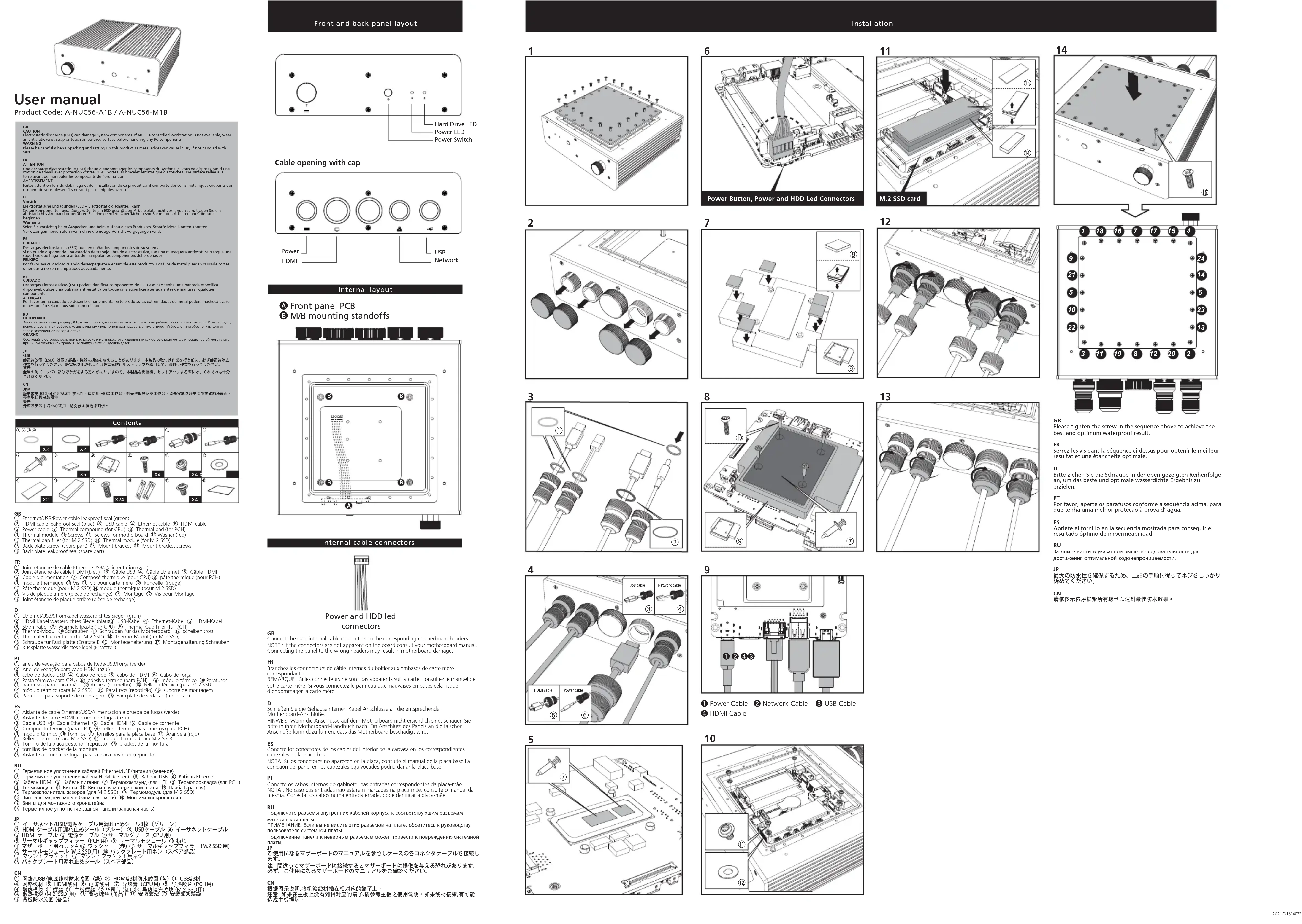 ① Joint étanche de câble Ethernet/USB/d'alimentation (vert) ② Joint étanche de câble HDMI (bleu) ③ Câble USB ④ Câble Ethernet ⑤ Câble HDMI ⑥ Câble d'alimentation ⑦ Composé thermique (pour CPU) ⑧ pâte thermique (pour PCH) ⑨ module thermique ⑩ Vis ⑪ vis pour carte mère ⑫ Rondelle (rouge) ⑬ Pâte thermique (pour M.2 SSD) ⑭ module thermique (pour M.2 SSD) ⑮ Vis de plaque arrière (pièce de rechange) ⑯ Montage ⑰ Vis pour Montage ⑱ Joint étanche de plaque arrière (pièce de rechange)