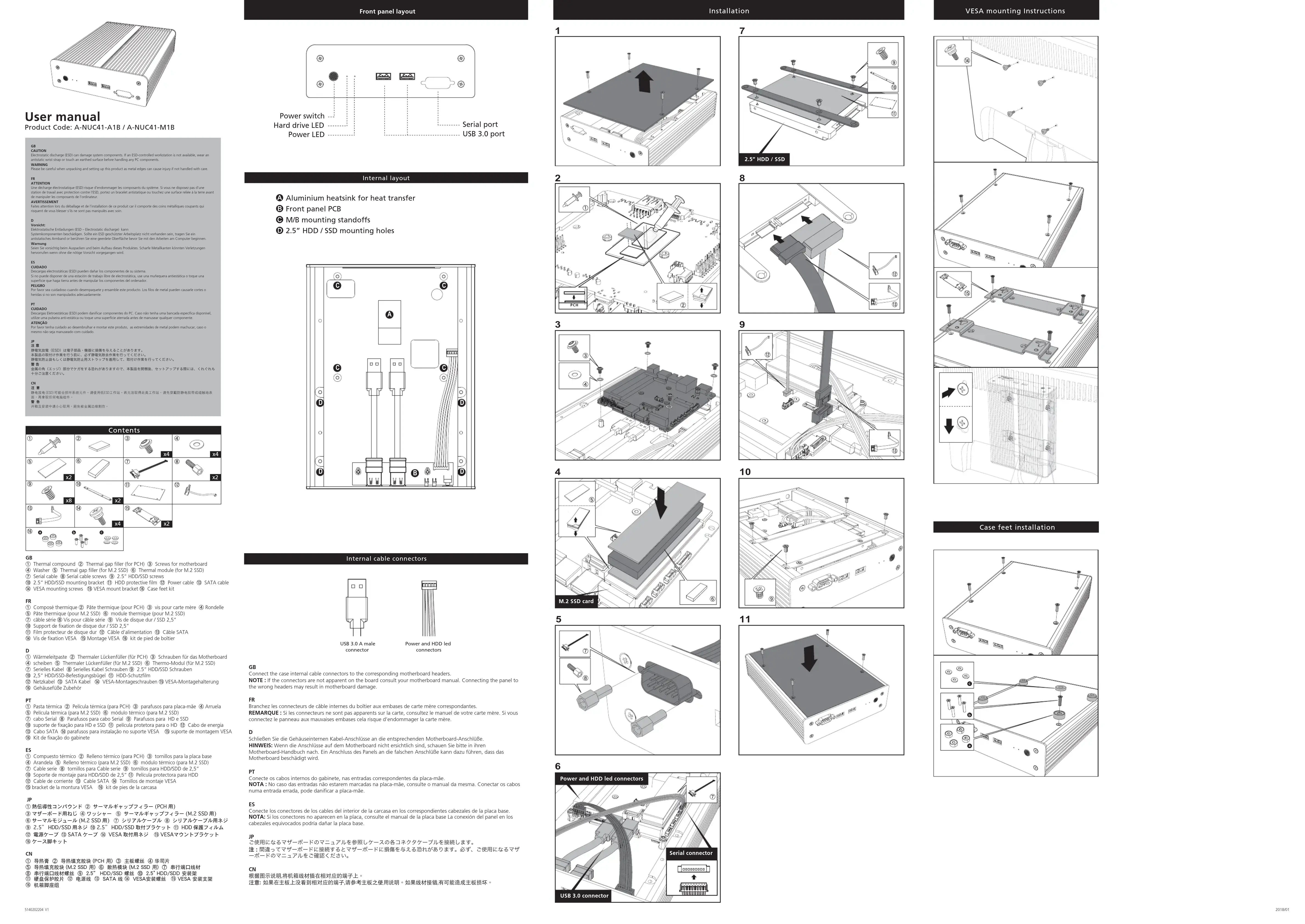 ① Composé thermique ② Pâte thermique (pour PCH) ③ vis pour carte mère ④ Rondelle ⑤ Pâte thermique (pour M.2 SSD) ⑥ module thermique (pour M.2 SSD) ⑦ câble série ⑧ Vis pour câble série ⑨ Vis de disque dur / SSD 2,5” ⑩ Support de fixation de disque dur / SSD 2,5” ⑪ Film protecteur de disque dur ⑫ Câble d'alimentation ⑬ Câble SATA ⑭ Vis de fixation VESA ⑮ Montage VESA ⑯ kit de pied de boîtier