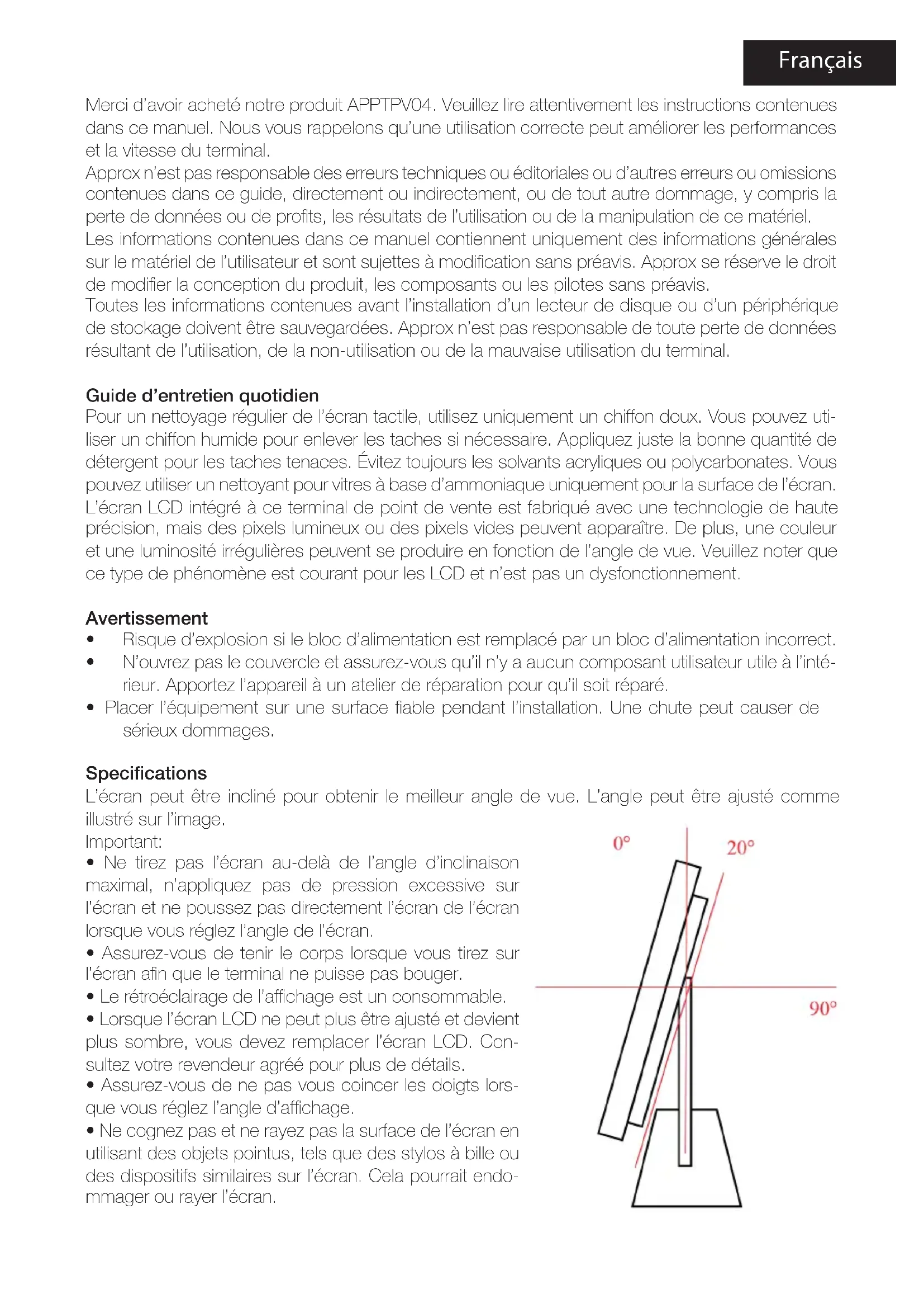 Merci d'avoir acheté notre produit APPTPV04. Veuillez lire attentivement les instructions contenues dans ce manuel. Nous vous rappelons qu'une utilisation correcte peut améliorer les performances et la vitesse du terminal.