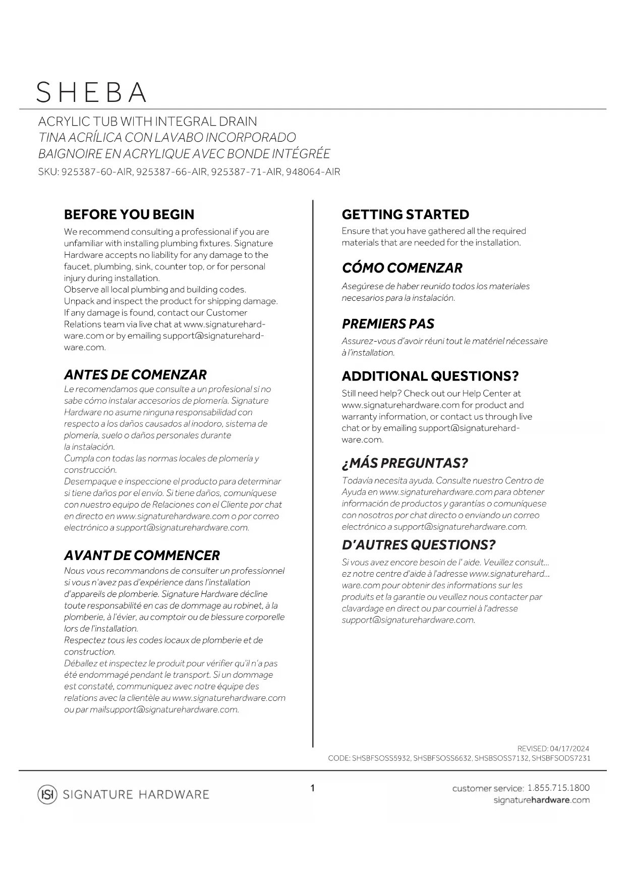 Sheba 462912 - Baignoire Signature Hardware - Notice d'utilisation et mode d'emploi gratuit