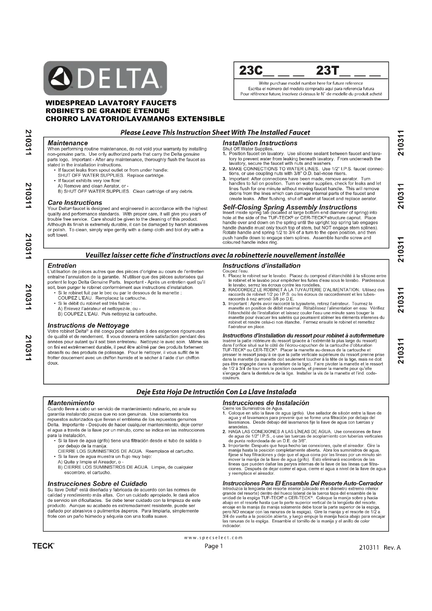 23C__ __ __ 23T__ __ __ Write purchase model number here for future reference Escriba el número del modelo comprado aqui para referencia futura Pour référence future, inscrivez ci-dessus le N˚ de modelle du produit acheté N° Pièce Manette a cinq nervures avec vis et indicateur rouge et bleu Vis pour manette et ensemble indicateur (avec vis pour manette courte et longue, rondelles indicatrices rouge et bleu) Mèche pour tournevis n°3 Scrulox Manette a lame de 4 po avec vis et ind. rouge et bleu et insertion alignez et insert d’alignement (1 de chacun) Insert d’alignement (12/pqt) Manette avec levier coiffant 3 po avec vis, indicateurs rouge et bleu et insert d’alignement (1 de chacun) Ensemble de conversion - 2 manettes avec levier coiffant 3 po, vis, indicateurs rouge et bleu, 2 inserts d’alignement, 1 cartouche droite et 1 cartouche gauche CER-TECK