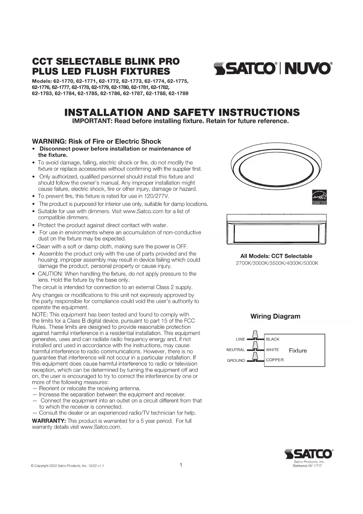 - ATTENTION: lors de la manipulation du luminaire, n’exercez pas de pression à la lentille. Tenez le luminaire uniquement par la base. Le circuit est destiné à être branché sur une alimentation externe de Classe 2. Toute modication apportée à cet appareil qui n’est pas expressément approuvée par la partie responsable de la conformité risquerait d’annuler l’autorisation de l’utilisateur à exploiter l’équipement. REMARQUE: Cet équipement a été testé et jugé conforme aux seuils établis pour un appareil numérique de Classe B, conformément à la partie 15 des règles de la FCC. Ces seuils sont censés fournir une protection raisonnable contre les interférences nuisibles dans une installation résidentielle. Cet équipement génère, utilise et peut émettre de l’énergie radioélectrique, et s’il n’est pas installé et utilisé conformément aux instructions, peut causer des interférences nuisibles aux communications radio. Cependant, il n’existe aucune garantie qu’une interférence ne se produira pas dans une installation particulière. Si cet appareil provoque des interférences nuisibles à la réception radio ou télévisuelle, ce que l’on peut vérier en éteignant et en allumant l’appareil, l’utilisateur devrait tenter d’y remédier en appliquant une ou plusieurs des mesures suivantes: – Réorienter ou déplacer l’antenne du récepteur. – Augmenter la distance entre l’équipement et le récepteur. – Brancher l’équipement sur une prise d’un circuit autre que celui sur lequel le récepteur est branché. – Consulter le distributeur ou un technicien en radio/télévision d’expérience pour obtenir de l’aide. GARANTIE: Ce produit est garanti pour une période de 5 ans. Pour plus de détails sur la garantie, visitez www.Satco.com. INSTALLATION – 12 po, 15 po, 19 po Rond ÉTAPE 1: COUPEZ l’alimentation électrique avant l’installation. Avant l’installation, choisissez votre température de couleur apparente (TK) préférée en plaçant le commutateur à l’une des positions suivantes: 2700K, 3000K, 3500K, 4000K ou 5000K. ÉTAPE 2: Visser le support de montage sur la boîte de jonction. Utilisez les ancrages fournis pour un support supplémentaire pour le support. ÉTAPE 3: Connectez les ls avec les capuchons de câblage fournis. Voir le schéma de câblage à la page 1. ÉTAPE 4: Alignez les clips avec le support de montage (en utilisant les autocollants échés sur le cadre pour vous guider) et poussez le luminaire vers le haut et tournez dans le sens des aiguilles d’une montre pour verrouiller le luminaire dans le support de montage. Allumez l’alimentation. L’installation est terminée. INSTALLATION – 12 po Carré ÉTAPE 1: COUPEZ l’alimentation électrique avant l’installation. Avant l’installation, choisissez votre température de couleur apparente (TK) préférée en plaçant le commutateur à l’une des positions suivantes: 2700K, 3000K, 3500K, 4000K ou 5000K. ÉTAPE 2: Visser le support de montage sur la boîte de jonction. Utilisez les ancrages fournis pour un support supplémentaire pour le support. ÉTAPE 3: Connectez les ls avec les capuchons de câblage fournis. Voir le schéma de câblage à la page 1. ÉTAPE 4: Alignez les clips avec le support de montage (en utilisant les autocollants échés sur le cadre pour vous guider) et poussez le luminaire vers le haut et faites glisser le luminaire dans le support de montage pour le verrouiller en place. Allumez l’alimentation. L’installation est terminée. INSTALLATION – 5 pi, 5 po x 24 po, 5 pi, 5 po x 36 po, 5 pi, 5 po x 48 po, 1 pi x 2 pi, 2 pi x 2 pi, 1 pi x 4 pi ÉTAPE 1: COUPEZ l’alimentation électrique avant l’installation. Avant l’installation, choisissez votre température de couleur apparente (TK) préférée en plaçant le commutateur à l’une des positions suivantes: 2700K, 3000K, 3500K, 4000K ou 5000K. ÉTAPE 2: Visser le support de montage sur la boîte de jonction. Utilisez les ancrages fournis pour un support supplémentaire pour le support. ÉTAPE 3: Branchez le câble de sécurité à la plaque de montage. ÉTAPE 4: Connectez les ls avec les capuchons de câblage fournis. Voir le schéma de câblage à la page 1. ÉTAPE 5: Alignez les clips avec le support de montage (en utilisant les autocollants échés sur le cadre pour vous guider) et poussez le luminaire vers le haut et faites glisser le luminaire dans le support de montage pour le verrouiller en place. Allumez l’alimentation. L’installation est terminée.