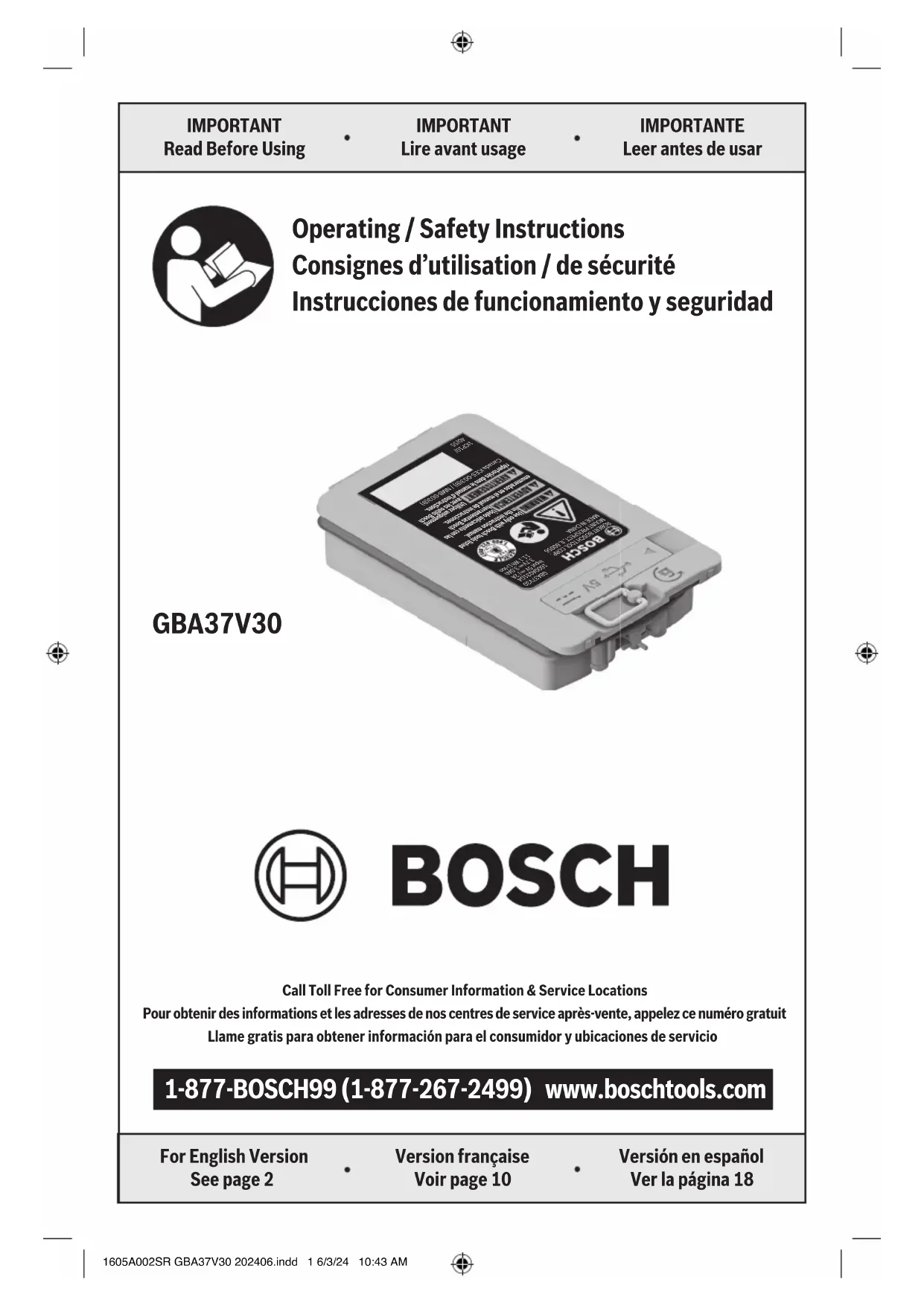 C’est le symbole d’alerte relatif à la sécurité. Il est utilisé pour vous avertir de l’existence pos- sible d’un danger de lésion corporelle. Obéissez à tous les messages relatifs à la sécurité qui suivent ce symbole pour éviter tout risque de blessure ou même de mort. Alerte l’utilisateur pour lire le mode d’emploi Ce symbole désigne le fait que cet outil est vérifié par les Intertek Testing Services. Désigne le programme de recyclage des piles Li-ion. EP5018959 ENERGY PERFORMANCE VERIFIEDRENDEMENT ENERGETIQUE VERIFIE1605A002SR GBA37V30 202406.indd 14 6/3/24 10:44 AM15 Familiarisez-vous avec votre produit ROBERT BOSCH TOOL CORP.MOUNT PROSPECT, IL 60056MADE IN CHINA1ICP10/40/55Canada ICES-003(B) / NMB-003(B)GBA37V301600A031G4Input 5V / 2A3.7V 3.0Ah11.1 Wh Li-Ion Use only with Bosch tools listed in the instruction manual. Úselo únicamente con las herramientas Bosch enumeradas en el manual de instrucciones. Utilisez uniquement avec les outils Bosch répertoriés dans le manuel d'instructions.