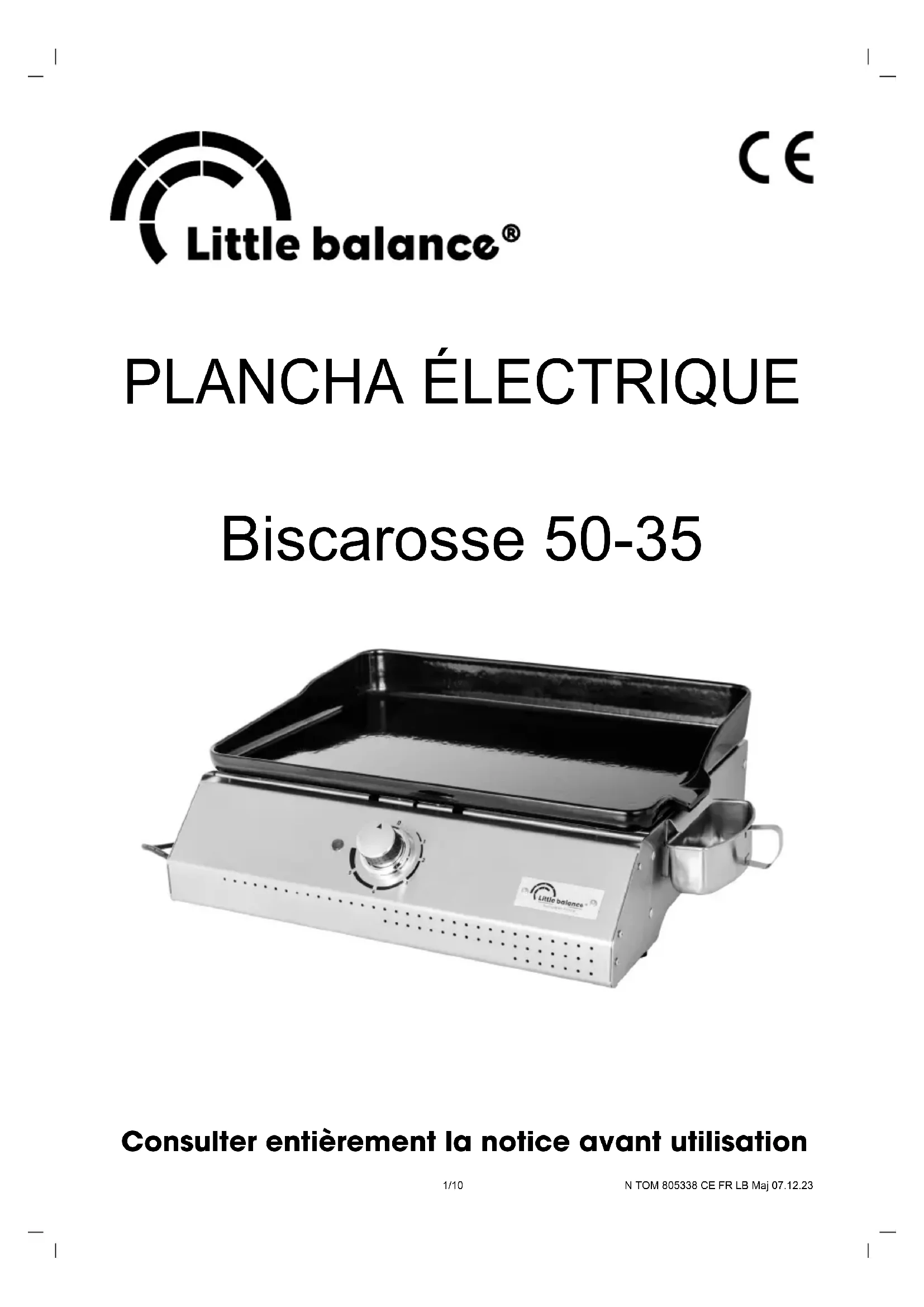 N’utilisez pas cet appareil si toutes les pièces ne sont pas en place. L’appareil doit être correctement monté conformément au manuel d’assemblage. A/ Préparation de l’appareil ATTENTION: MEME LORSQUE L’APPAREIL N’EST PAS EN FONCTION, DEBRANCHER LA FICHE DE LA PRISE DE COURANT ELECTRIQUE AVANT D’INTRODUIRE OU DE RETIRER LES DIFFERENTS COMPOSANTS OU AVANT DE PROCEDER A SON NETTOYAGE. N.B. : Avant la première utilisation de l’appareil, il est recommandé de le nettoyer et de l’utiliser une fois « à vide » : Nettoyer la plaque de cuisson avec un chiff on ou une éponge humide, puis essuyez-la. Branchez l’appareil dans une prise de courant et laissez-le allumé pendant 10 minutes. Lors des premières utilisations, l’appareil peut émettre de la fumée et/ou une odeur ; ceci est normal et n’aff ecte en rien son fonctionnement. Après dix minutes, débranchez l’appareil et laissez-le refroidir. Lorsque l’appareil est froid, nettoyez la plaque de cuisson. Avant d’utiliser l’appareil, laver la plaque ainsi que le tiroir de récupération des graisses avec de l’eau chaude et du produit vaisselle délicat. Essuyer correctement. Pour faciliter le nettoyage, recouvrir le tiroir avec du papier alu pour récupérer les gras et les sauces. Brancher la fi che du cordon d’alimentation dans une prise de courant munie d’une mise à la terre. Tourner le bouton du thermostat de façon à ce que la température désirée soit alignée au point de référence du bouton. Le voyant s’allume. Quand le voyant lumineux du thermostat s’éteint, cela signifi e que la température de cuisson désirée a été atteinte et que le gril est prêt pour l’emploi. Le voyant lumineux du thermostat indique que le gril est en phase de réchauff ement. Le voyant lumineux reste allumé tant que la température programmée n’est pas atteinte, après quoi il s’allume et s’éteint de façon alternée pendant toute la cuisson afi n de garantir le maintien de la température sélectionnée. Le temps de réchauff ement dépend du réglage de la chaleur sélectionnée. Plus la chaleur sélectionnée est élevée, plus le temps de réchauff ement sera long.N TOM 805338 CE FR LB Maj 07.12.23 8/10 B/ Cuisson Placer les aliments à cuire sur la plaque à l’aide d’une spatule ou pinces de cuisine. ATTENTION: Pour ne pas endommager la surface émaillée de la plaque, ne pas utiliser d’objets métalliques, tranchants ou pointus. ATTENTION: Pendant le fonctionnement, pour éviter de se brûler, porter toujours des gants de protection. C/ Extinction de l’appareil Quand la cuisson est terminée, tourner le bouton du thermostat en position “0” et débrancher la fiche de la prise de courant. D/ Nettoyage et entretien Attendre le complet refroidissement de la plancha. Pour des raisons d’hygiène et de sécurité : nettoyez soigneusement votre appareil et l’ensemble de ses accessoires (y compris le récolte graisse) après chaque cuisson avec une eau chaude savonneuse pour éliminer tous les résidus de graisses et à l’aide d’un chiffon doux non abrasif. E/ Service après vente Gardez cette notice car pour toute demande de pièces détachées, il faudra rappeler la référence marquée en bas de chaque page ainsi que le numéro de la pièce perdue ou défectueuse. Pour demander les pièces de rechange, ces dernières peuvent être vendues en vous adressant au magasin ou à notre service après vente au numéro suivant : 00.33(0)3.85.32.27.50 (SOMAGIC) LITTLE BALANCE décline toute responsabilité en cas de dommage ou de mauvais fonctionnement survenant du fait de l’utilisation d’accessoires et/ou pièces de rechange de marque différente.N TOM 805338 CE FR LB Maj 07.12.23 9/10 F/ Garantie Cette plancha est garantie 2 ans à compter de la date d’achat (facture ou ticket de caisse à l’appui). Cette garantie n’est pas valable dans les cas suivants :