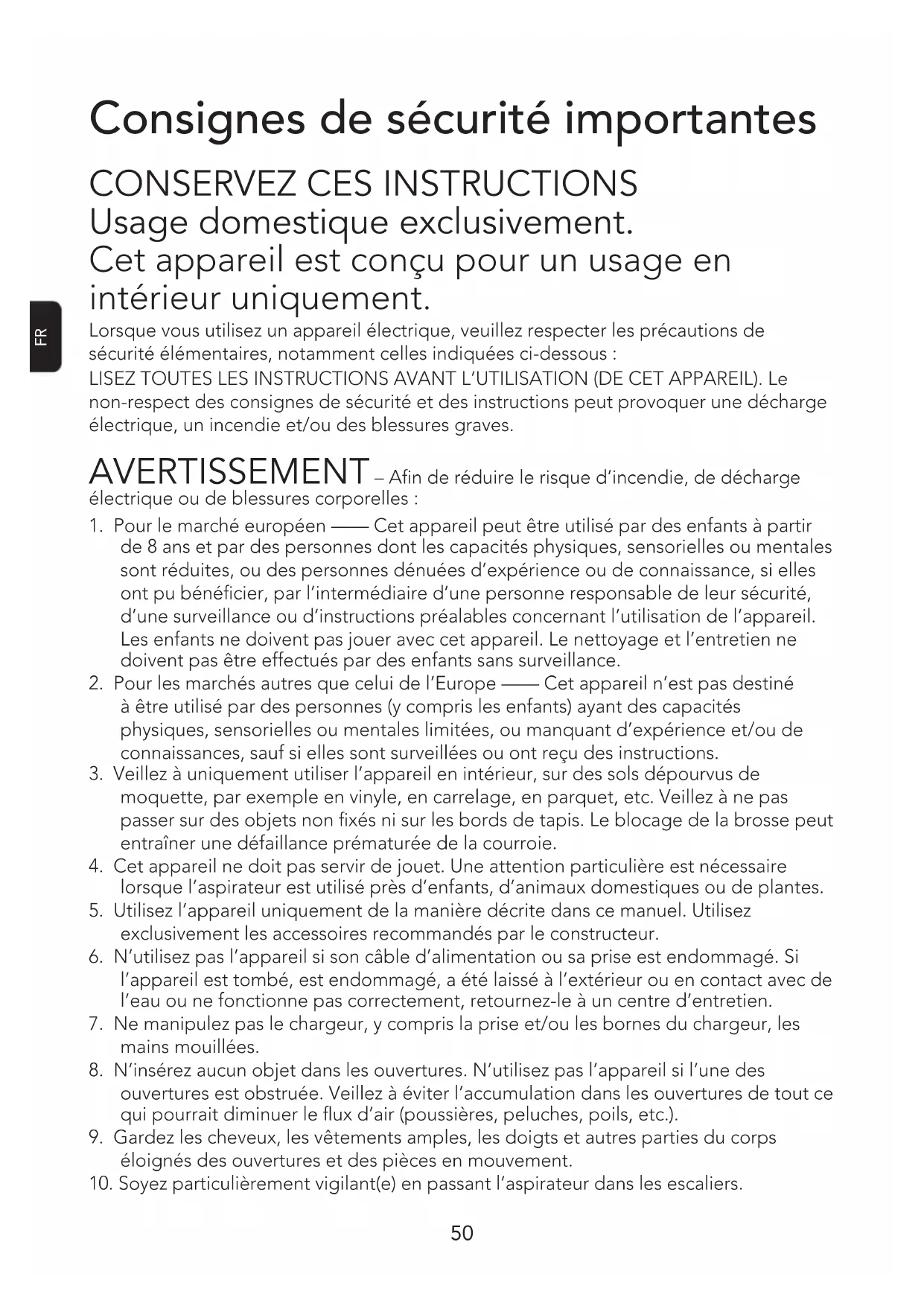 Usage domestique exclusivement. Cet appareil est conçu pour un usage en intérieur uniquement. Lorsque vous utilisez un appareil électrique, veuillez respecter les précautions de sécurité élémentaires, notamment celles indiquées ci-dessous: LISEZ TOUTES LES INSTRUCTIONS AVANT L’UTILISATION (DE CET APPAREIL). Le non-respect des consignes de sécurité et des instructions peut provoquer une décharge électrique, un incendie et/ou des blessures graves. AVERTISSEMENT – An de réduire le risque d’incendie, de décharge électrique ou de blessures corporelles: