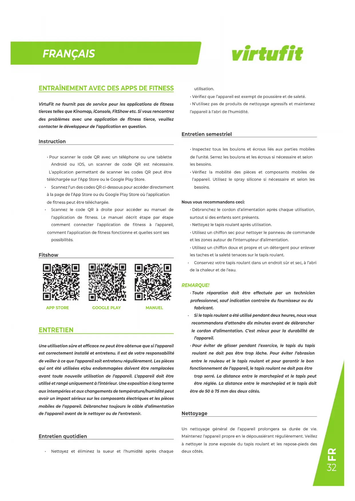 - Pour éviter de glisser pendant l’exercice, le tapis du tapis roulant ne doit pas être trop lâche. Pour éviter l’abrasion entre le rouleau et le tapis roulant et pour garantir le bon fonctionnement de l’appareil, le tapis roulant ne doit pas être trop serré. La distance entre le marchepied et le tapis peut être réglée. La distance entre le marchepied et le tapis doit être de 50 à 75 mm des deux côtés. Nettoyage Un nettoyage général de l’appareil prolongera sa durée de vie. Maintenez l’appareil propre en le dépoussiérant régulièrement. Veillez à nettoyer la zone exposée du tapis roulant et les repose-pieds des deux côtés. ENTRAÎNEMENT AVEC DES APPS DE FITNESS VirtuFit ne fournit pas de service pour les applications de fitness tierces telles que Kinomap, iConsole, FitShow etc. Si vous rencontrez des problèmes avec une application de fitness tierce, veuillez contacter le développeur de l’application en question. Instruction