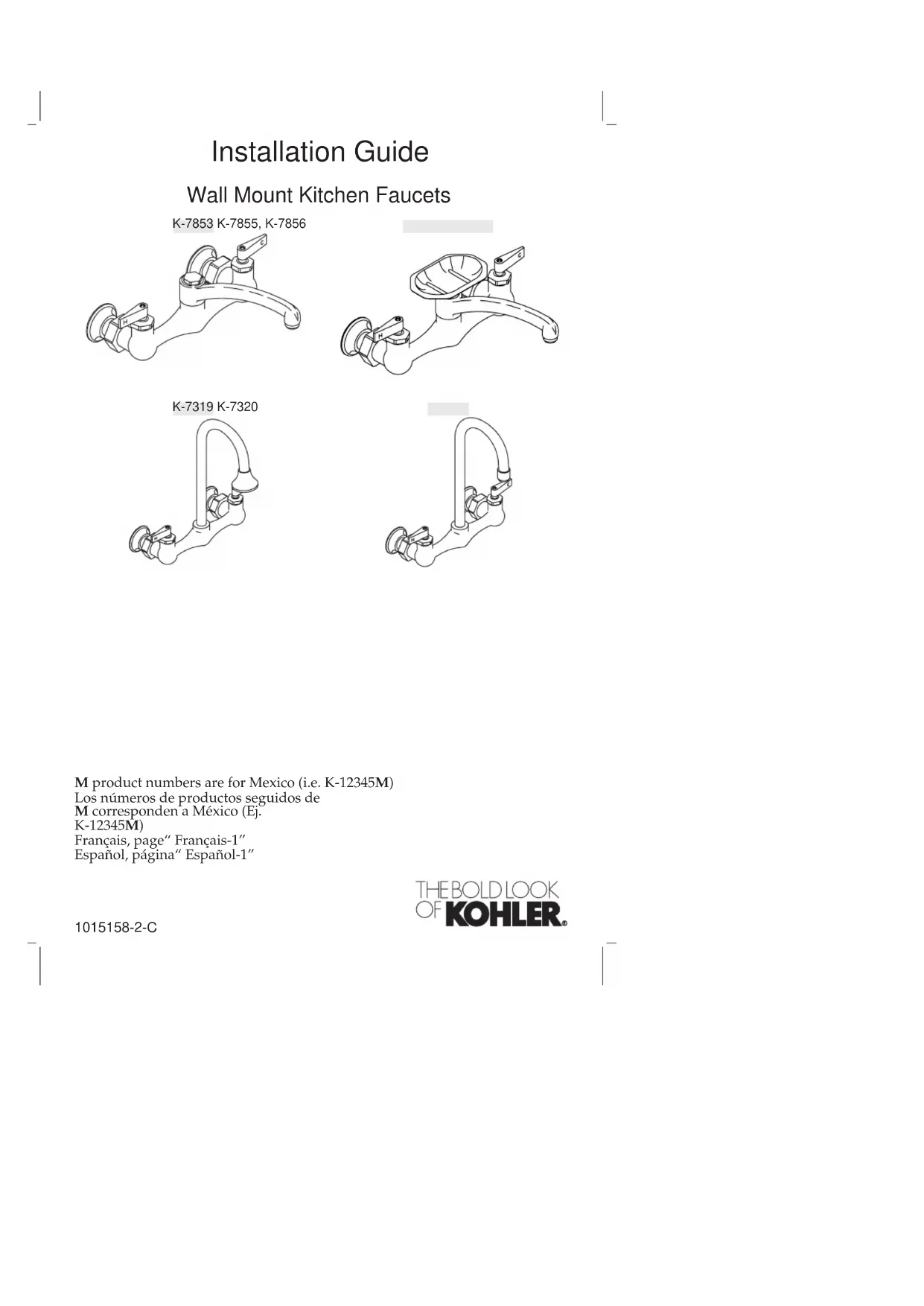 Ensure that all connections are tight. Open the drain. Turn on the main water supply. Twist the aerator counterclockwise until it is removed from the spout. Open both hot and cold valves. Run water through the spout for approximately one minute to remove debris. Check for leaks. Remove any debris from the aerator and reinstall. Soap Dish Soap Dish Post Assembly Spout Post Cap Kohler Co. 5 1015158-2-C Foraninstallationwithasoapdish:Guide d’installation Robinets de cuisine à fixation murale Outils et matériels Merci d’avoir choisi la compagnie Kohler Nous apprécions votre engagement envers la qualité Kohler. Veuillez prendre s’il vous plaît quelques minutes pour lire ce manuel avant de commencer l’installation. Ne pas hésiter à nous contacter en cas de problème d’installation ou de fonctionnement. Nos numéros de téléphone et notre adresse du site internet sont au verso. Merci encore d’avoir choisi la compagnie Kohler. Avant de commencer REMARQUE : Utiliser des sangles à deux trous ou coude à oreilles et des vis pour sécuriser les alimentations d’eau dans le mur. Respecter tous les codes de plomberie et de bâtiment locaux. Couper l’arrivée d’eau principale. Vérifier avec soin si l’évacuation ou les tubes d’arrivée d’eau sont endommagés. Replacer les tubes d’alimentation ou d’évacuation si nécessaire. Kohler Co. se réserve le droit d’apporter toutes modifications sur le design des robinets sans préavis, comme spécifié dans le catalogue des prix. Clé à molette Clé à siège de 7/16" Clé à fourche Kohler Co. Français-1 1015158-2-C1. Installer le manche excentrique Glisser un écrou de couplage et une bride sur chaque manche excentrique froid et chaud. Mesurer et installer le mamelon. Si le manche excentrique a un filetage femelle, les mamelons devraient s’étendre de 3/8″ (1 cm) à 1/2″ (1,3 cm) à partir de l’avant du mur. Si la queue excentrique a un filetage mâle, le mamelon devrait être d’égalité avec l’avant du mur. Visser un manche excentrique sur chaque mamelon froid et chaud. S’assurer que chaque bride soit serrée contre le mur fini. Mamelon Bride Bride Écrou de couplage Écrou de couplage Manche excentirique (filetage femelle) Manche excentirique (filetage mâle) Kohler Co. Français-2 1015158-2-C2. Installer l’ensemble du robinet. REMARQUE : Les manches des robinets chaud et froid sont excentriques pour permettre le réglage. Insérer une rondelle dans chaque écrou de couplage froid et chaud. Aligner et insérer l’ensemble du robinet dans chaque manche de robinet froid et chaud. Visser partiellement chaque écrou de couplage froid et chaud sur le filetage du robinet jusqu’au serrage. Vérifier le nivelage de l’ensemble du robinet. Si l’ensemble du robinet n’est pas nivelé, pivoter les manches excentriques froid et chaud avec une clé à siège de 7/16″. Après le réglage, bien sécuriser chaque écrou de couplage froid et chaud. Rondelle Écrou de couplage Corps