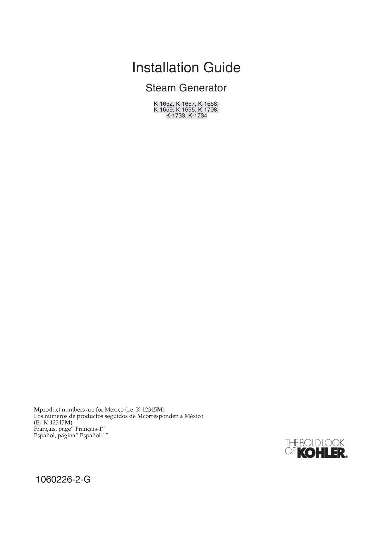 réservoir d’eau et/ou le tuyau d’évacuation de vapeur pendant l’opération du générateur ou juste après son arrêt. Utiliser des lunettes et des vêtements de protection pendant l’entretien du générateur de vapeur. Le générateur de vapeur fonctionne à hautes températures. AVIS: N’utiliser cette unité que pour l’usage destiné tel qu’indiqué dans ce manuel. NE PAS utiliser des dispositifs de fixation non recommandés par la Kohler Co. AVIS: Ne pas appliquer de chaleur excessive sur les raccords de générateur pendant le soudage des connexions. Ne pas mettre de décapant ou d’acide directement sur le générateur, pour éviter d’endommager les joints, composants en plastique ou pièces internes. Ne pas appliquer de lubrifiants à base de pétrole sur les composants du générateur, au risque de l’endommager. Inspecter le produit pour s’assurer de l’absence de tout dommage. Contacter le service d’assistance à la clientèle de KOHLER en utilisant l’information fournie à l’arrière de ce guide. Respecter tous les codes de plomberie et électriques locaux. Tout le travail électrique doit être réalisé par un électricien qualifié. Débrancher avant d’effectuer toute connexion électrique. Kohler Co. se réserve le droit d’apporter toutes modifications sur le design des produits et ceci sans préavis, tel que spécifié dans le catalogue des prix. 1060226-G Français-2 Kohler Co.1. Déterminer la disposition