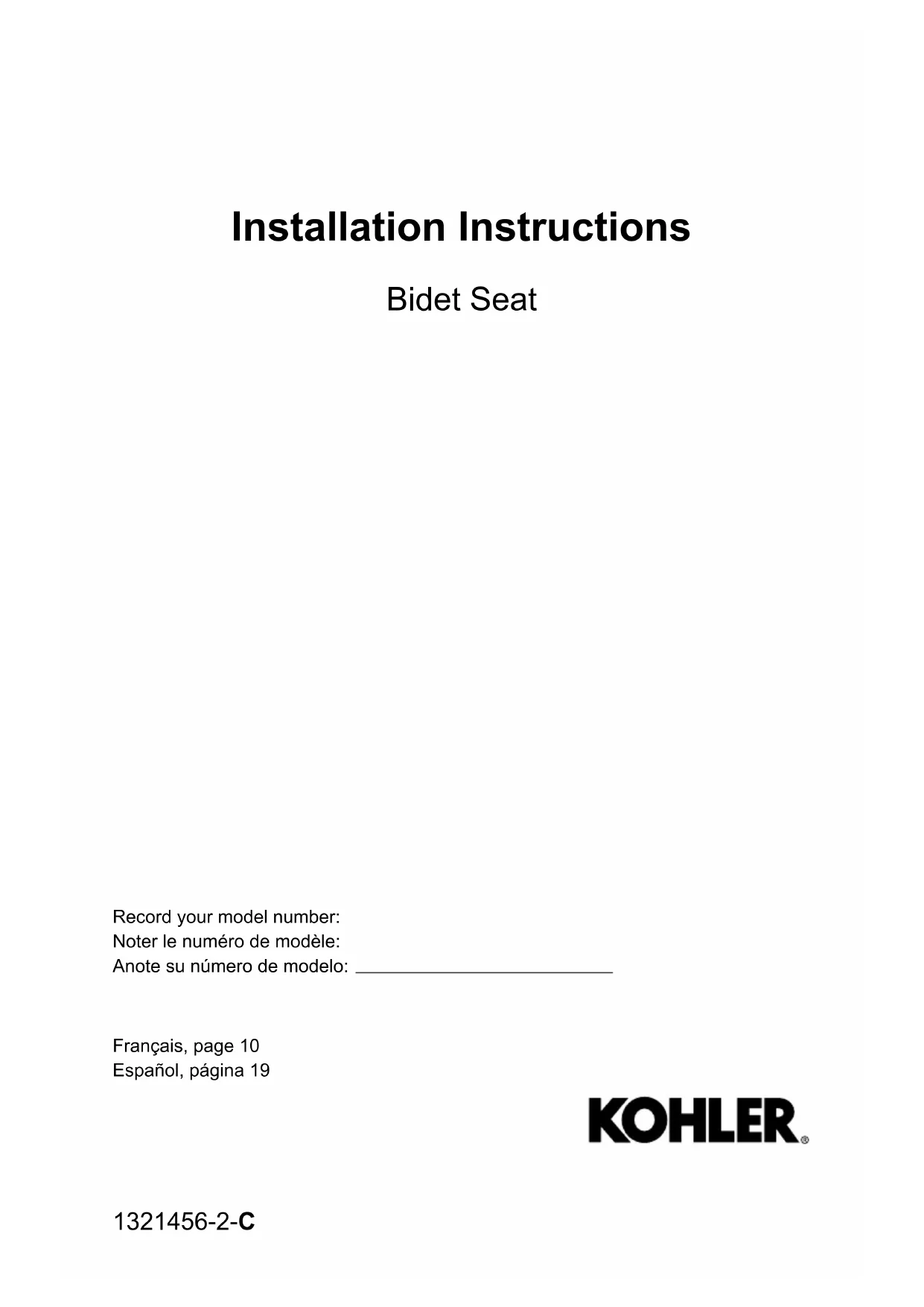 R5. Vérifier l'installation REMARQUE : Il est également possible de recouvrir le siège avec un lm plastique étirable, en option. Les fonctions peuvent être testées pendant que l'on est assis sur le siège ou lorsque l'on couvre la baguee avec la main. REMARQUE : Lors du test des fonctions, appliquer une pression sur le capteur de présence sur le côté gauche du siège (face à la toilee). Les fonctions ne s'activent pas si aucune pression n'est exercée sur le capteur. Optionnel : Envelopper le siège avec un lm en plastique étirable pour empêcher une pulvérisation au-delà de la toilee lors de l’exécution des essais. Brancher le cordon d'alimentation dans la prise électrique. Le siège passera par une séquence de mise sous tension. Le siège ne fait plus de bruit lorsque la mise en marche est terminée. Consulter le guide du propriétaire pour tester les fonctions du siège. 1321456-2-C 18 Kohler Co.