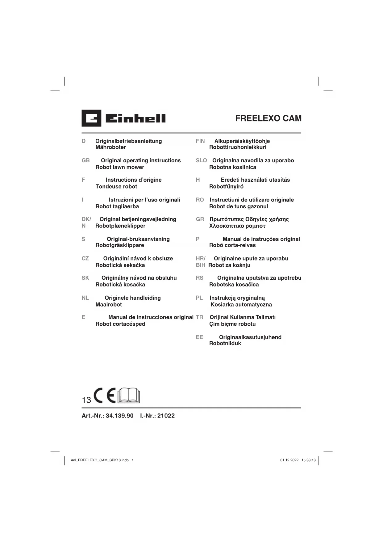 www.Einhell-Service.com. Veuillez garder à disposition la preuve d‘achat ou tout autre justifi catif de l‘achat de votre nouvel appareil. Les appareils envoyés sans les justifi catifs correspondants ou sans plaque signalétique sont exclus de la prestation de garantie en raison de l‘impossibilité de les enregistrer. Si le défaut de l‘appareil est inclut dans la garantie, vous recevrez sans délai un appareil réparé ou un nouvel appareil. Bien entendu, nous réparons volontiers les défauts de votre appareil qui ne sont pas ou plus compris dans l‘étendue de la garantie contre le remboursement des frais de réparation. Pour cela, veuillez envo- yer l‘appareil à notre adresse de service après-vente. Pour les pièces d‘usure, de consommation et manquantes, nous renvoyons aux restrictions de cette ga- rantie conformément aux informations du service après-vente de ce mode d‘emploi. Anl_FREELEXO_CAM_SPK13.indb 98Anl_FREELEXO_CAM_SPK13.indb 98 01.12.2022 15:35:4501.12.2022 15:35:45I