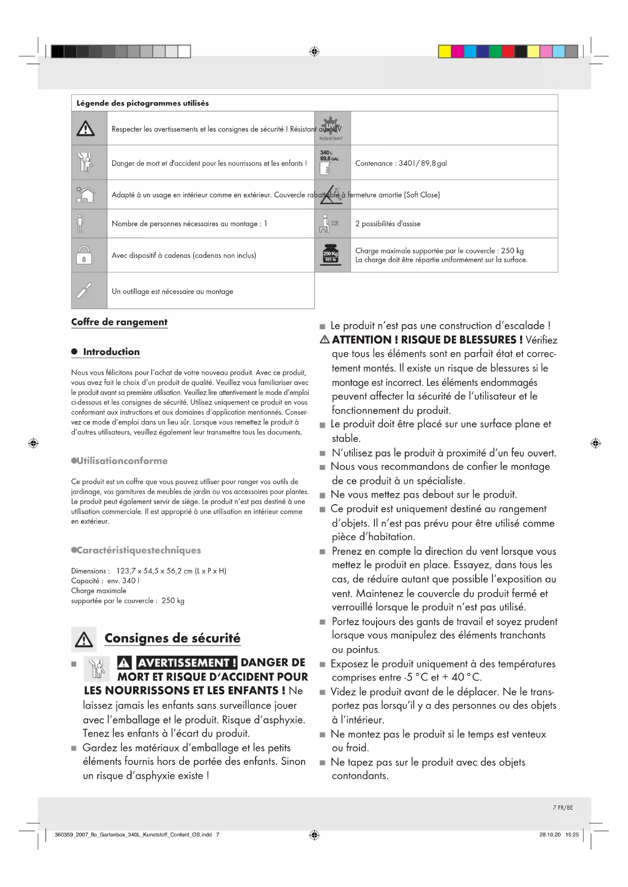 LES NOURRISSONS ET LES ENFANTS! Ne laissez jamais les enfants sans surveillance jouer avec l‘emballage et le produit. Risque d‘asphyxie. Tenez les enfants à l‘écart du produit. Gardez les matériaux d‘emballage et les petits éléments fournis hors de portée des enfants. Sinon un risque d‘asphyxie existe ! Le produit n‘est pas une construction d‘escalade ! ATTENTION! RISQUE DE BLESSURES ! Vérifiez que tous les éléments sont en parfait état et correc- tement montés. Il existe un risque de blessures si le montage est incorrect. Les éléments endommagés peuvent affecter la sécurité de l‘utilisateur et le fonctionnement du produit. Le produit doit être placé sur une surface plane et stable. N‘utilisez pas le produit à proximité d‘un feu ouvert. Nous vous recommandons de confier le montage de ce produit à un spécialiste. Ne vous mettez pas debout sur le produit. Ce produit est uniquement destiné au rangement d‘objets. Il n‘est pas prévu pour être utilisé comme pièce d‘habitation. Prenez en compte la direction du vent lorsque vous mettez le produit en place. Essayez, dans tous les cas, de réduire autant que possible l‘exposition au vent. Maintenez le couvercle du produit fermé et verrouillé lorsque le produit n‘est pas utilisé. Portez toujours des gants de travail et soyez prudent lorsque vous manipulez des éléments tranchants ou pointus. Exposez le produit uniquement à des températures comprises entre -5 °C et + 40 °C. Videz le produit avant de le déplacer. Ne le trans- portez pas lorsqu‘il y a des personnes ou des objets à l‘intérieur. Ne montez pas le produit si le temps est venteux ou froid. Ne tapez pas sur le produit avec des objets contondants. 360359_2007_flo_Gartenbox_340L_Kunststoff_Content_OS.indd 7360359_2007_flo_Gartenbox_340L_Kunststoff_Content_OS.indd 7 28.10.20 15:2528.10.20 15:258 FR/BE Vérifiez régulièrement que le produit est posé de manière stable et sûre. Ne convient pas au stockage de substances inflam- mables ou corrosives. Ne stockez jamais des objets chauds dans le produit (par ex. des grils qui viennent tout juste d‘être utilisés, des lampes à souder, des fers à repasser etc.). Ne convient pas au stockage d‘aliments. Ne convient pas au stockage à long terme des textiles lorsqu‘ils sont utilisés à l‘extérieur. En cas de feu, n‘essayez pas d‘éteindre le polypropylène qui brûle avec de l‘eau. N‘enfermez pas de personne ni d‘animal dans le produit. En fermant le couvercle, faites attention à ne pas vous coincer les mains, en particulier en présence d‘enfants. Conservez les instructions de montage afin de pouvoir les consulter ultérieurement. Avant le montage Si des éléments manquent ou sont endommagés, veuillez vous adresser à votre revendeur local en présentant votre preuve d‘achat. Ce faisant, indiquez toujours l‘IAN. Le produit peut inclure quelques éléments métalliques tranchants. Ainsi, portez toujours des gants de travail. En raison d‘écarts, la taille réelle peut légèrement différer des dimensions indiquées. Montage Montez le produit comme représenté sur les illustrations 1 à 10. Nettoyage et entretien Évitez d‘utiliser de l‘huile ou un produit nettoyant à base d‘acétone. N‘utilisez pas de brosse dure ni de produit abrasif. Nettoyer le produit avec de l‘eau et une solution de nettoyage douce pour éviter d‘endommager la surface en plastique. Après la pluie, essuyez le produit avec un chiffon sec. Mise au rebut L’emballage se compose de matières recyclables pouvant être mises au rebut dans les déchetteries locales. Le produit et les matériaux d’emballage sont recyclables, mettez-les au rebut séparément pour un meilleur traitement des déchets. Le logo Triman n’est valable qu’en France. Votre mairie ou votre municipalité vous renseigneront sur les possibilités de mise au rebut des produits usagés. Garantie Article L217-16 du Code de la consommation Lorsque l‘acheteur demande au vendeur, pendant le cours de la garantie commerciale qui lui a été consentie lors de l‘acquisition ou de la réparation d‘un bien meuble, une remise en état couverte par la garantie, toute période d‘immobilisation d‘au moins sept jours vient s‘ajouter à la durée de la garantie qui restait à courir. Cette période court à compter de la demande d‘intervention de l‘acheteur ou de la mise à disposition pour réparation du bien en cause, si cette mise à disposition est postérieure à la demande d‘intervention. Indépendamment de la garantie commerciale souscrite, le vendeur reste tenu des défauts de conformité du bien et des vices rédhibitoires dans les conditions prévues aux articles L217-4 à L217-13 du Code de la consommation et aux articles 1641 à 1648 et 2232 du Code Civil. Article L217-4 du Code de la consommation Le vendeur livre un bien conforme au contrat et répond des défauts de conformité existant lors de la délivrance. Il répond également des défauts de conformité résultant de l‘emballage, des instructions de montage ou de l‘installation lorsque celle-ci a été mise à sa charge par le contrat ou a été réalisée sous sa responsabilité. Article L217-5 du Code de la consommation Le bien est conforme au contrat : 1° S´il est propre à l‘usage habituellement attendu d‘un bien semblable et, le cas échéant : - s‘il correspond à la description donnée par le vendeur et posséder les qualités que celui-ci a présentées à l‘acheteur sous forme d‘échantillon ou de modèle ; - s‘il présente les qualités qu‘un acheteur peut légitimement attendre eu égard aux déclarations publiques faites par le vendeur, par le producteur ou par son représentant, notamment dans la publicité ou l‘étiquetage ; 2° Ou s‘il présente les caractéristiques définies d‘un commun accord par les parties ou être propre à tout usage spécial recherché par l‘acheteur, por