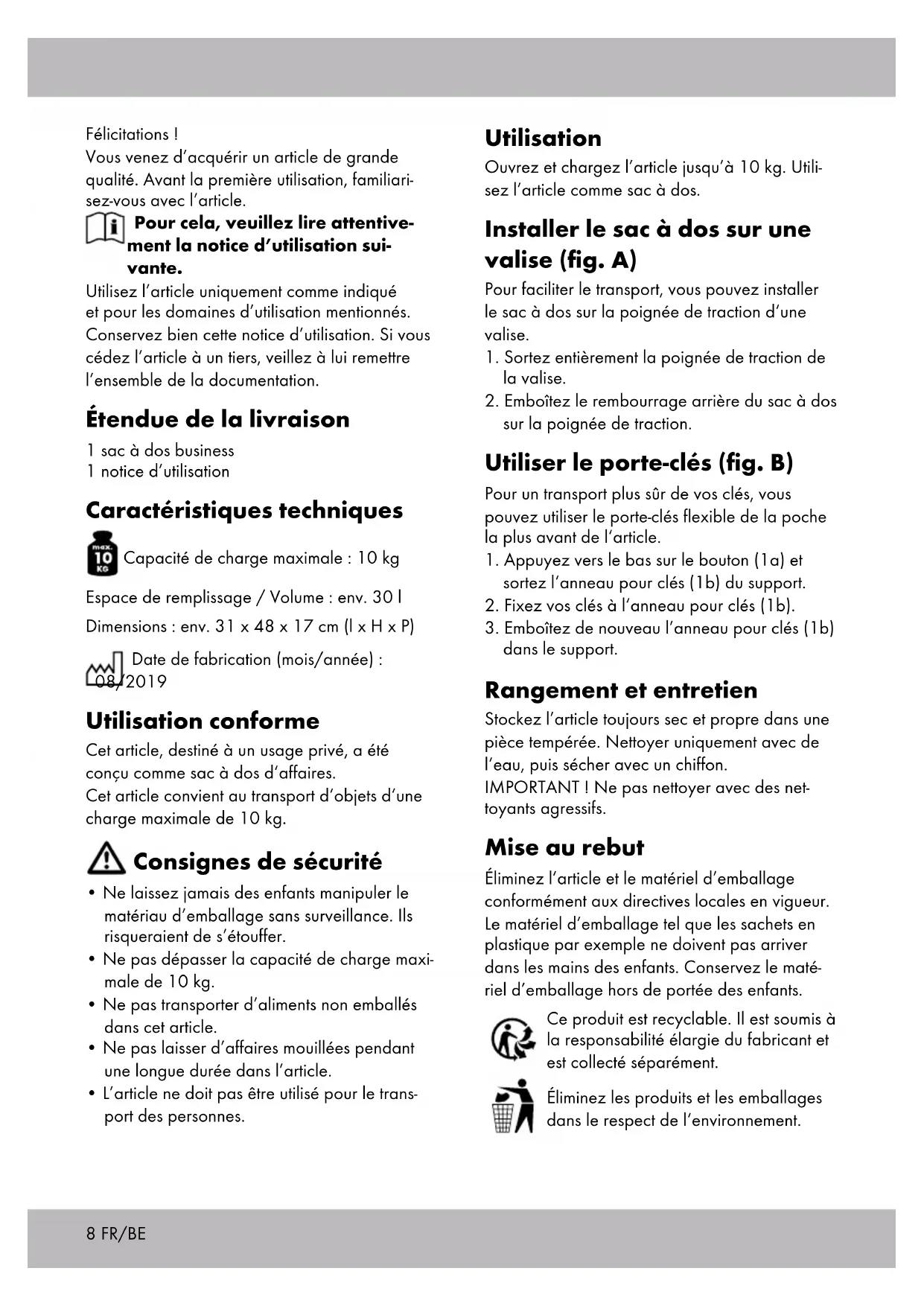 - L’article ne doit pas être utilisé pour le trans- port des personnes. Utilisation Ouvrez et chargez l’article jusqu’à 10 kg. Utili- sez l’article comme sac à dos. Installer le sac à dos sur une valise (fig. A) Pour faciliter le transport, vous pouvez installer le sac à dos sur la poignée de traction d‘une valise.