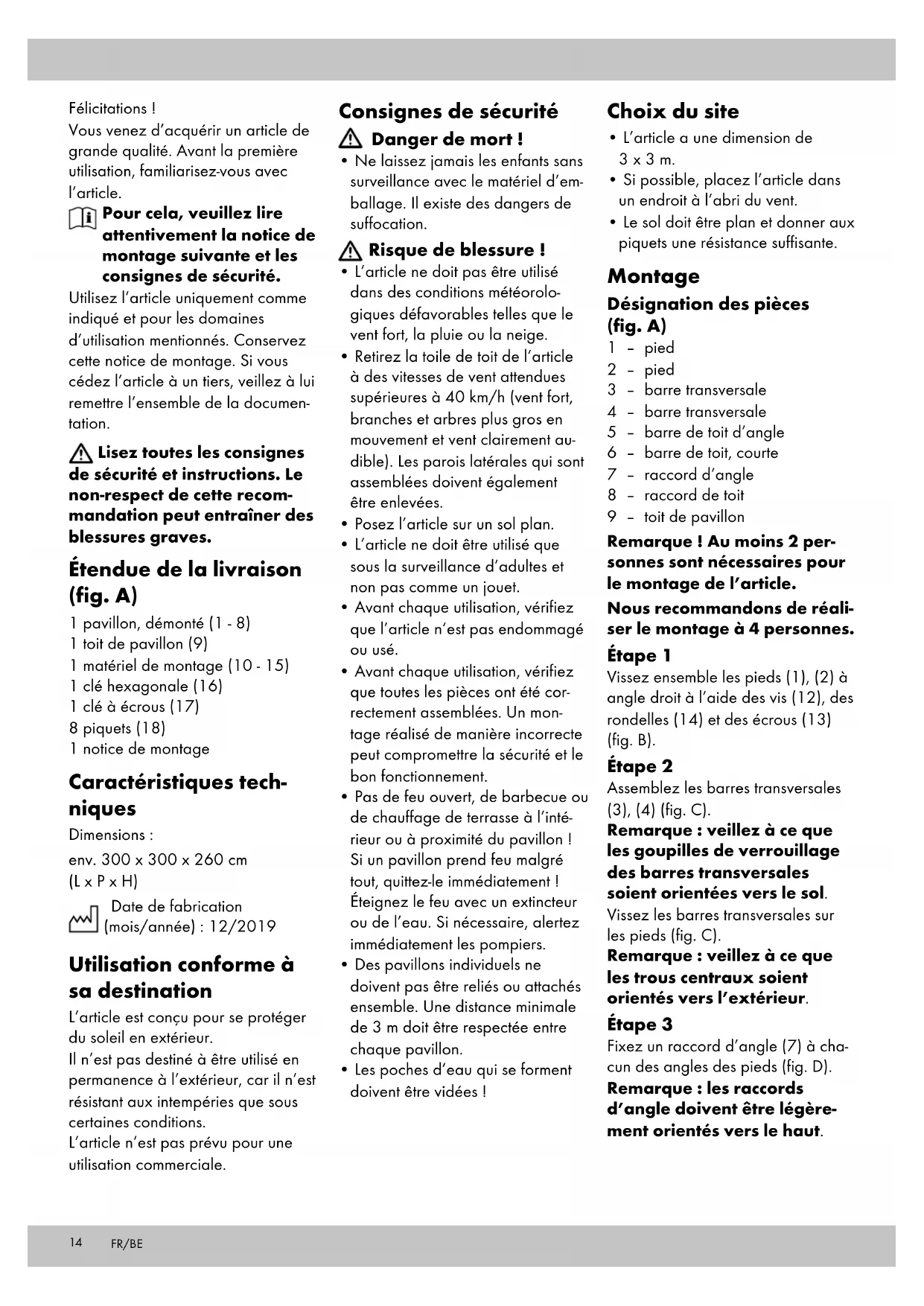 - Le sol doit être plan et donner aux piquets une résistance suffisante. Montage Désignation des pièces (fig. A) 1 – pied 2 – pied 3 – barre transversale 4 – barre transversale 5 – barre de toit d’angle 6 – barre de toit, courte 7 – raccord d’angle 8 – raccord de toit 9 – toit de pavillon Remarque ! Au moins 2 per- sonnes sont nécessaires pour le montage de l’article. Nous recommandons de réali- ser le montage à 4 personnes. Étape 1 Vissez ensemble les pieds (1), (2) à angle droit à l’aide des vis (12), des rondelles (14) et des écrous (13) (fig. B). Étape 2 Assemblez les barres transversales (3), (4) (fig. C). Remarque : veillez à ce que les goupilles de verrouillage des barres transversales soient orientées vers le sol. Vissez les barres transversales sur les pieds (fig. C). Remarque : veillez à ce que les trous centraux soient orientés vers l’extérieur. Étape 3 Fixez un raccord d’angle (7) à cha- cun des angles des pieds (fig. D). Remarque : les raccords d’angle doivent être légère- ment orientés vers le haut. FR/BE15 Étape 4 Placez le raccord de toit (8) au sol et insérez les barres de toit (5), (6) dans le raccord de toit (fig. E). Remarque : veillez à ce que les barres de toit d’angle s’enclenchent dans les côtés longs du raccord de toit. Les goupilles de verrouillage doivent être orientées vers le sol pour éviter une accumula- tion d’eau. Étape 5 Insérez les barres de toit d’angle dans les raccords d’angle (fig. F). Vissez les barres de toit sur les barres latérales (fig. F). Étape 6 Tirez le toit du pavillon (9) sur la structure de toit qui vient d’être montée (fig. G). Utilisez les bandes scratch du toit du pavillon pour le fixer à la structure de toit. Étape 7 Accrochez le toit du pavillon aux pieds (fig. H). Étape 8 Sécurisez l’article avec les piquets (18) (fig. H). Attention ! Vérifiez la bonne fixation des piquets. Remarque : si la fixation des piquets est insuffisante à cause d’un sol meuble, il est nécessaire d’ajouter des pi- quets supplémentaires ou de lester les pieds. Sur un sol dur sur lequel il est impossible d’utiliser des pi- quets, l’article devra être an- cré. Renseignez-vous auprès de votre revendeur spécialisé sur le matériel de montage approprié (non compris dans l’étendue de la livraison) pour votre sol. Démontage Étape 1 Retirez les piquets du sol. Étape 2 Enlevez les crochets et ouvrez les bandes scratch, puis retirez le toit du pavillon en le tirant. Étape 3 Dévissez les vis qui relient la struc- ture de toit aux barres transversales. Déverrouillez les goupilles de ver- rouillage des barres de toit d’angle et des raccords d’angle. Prudence ! Risque de pince- ment ! Étape 4 Retirez la structure de toit en la soulevant. Étape 5 Appuyez sur les goupilles de ver- rouillage des barres de toit pour retirer les barres de toit des raccords de toit. Étape 6 Dévissez les vis des raccords d’angle et retirez les raccords d’angle. Étape 7 Dévissez les vis des barres latérales et appuyez sur les goupilles de ver- rouillage pour démonter les barres latérales. Étape 8 Dévissez et retirez les vis des pieds. Étape 9 Rangez l’article sec et nettoyé et stockez-le à une température am- biante. Stockage, nettoyage, entretien Stockage Lorsque vous n’utilisez pas l’article, rangez-le toujours dans un endroit sec et propre à une température ambiante. Nettoyage Nettoyez l’article avec un chiffon humide et un produit de nettoyage doux. N’utilisez pas d’essence, de solvants ou de détergents agressifs. Conseils d’entretien Le toit du pavillon peut être traité avec un spray d’imprégnation. Mise au rebut Éliminez l’article et le matériel d’emballage conformément aux directives locales en vigueur. Le matériel d’emballage tel que les sachets en plastique par exemple ne doivent pas arriver dans les mains des enfants. Conservez le matériel d’emballage hors de portée des enfants. Ce produit est recyclable. Il est soumis à la responsabilité élargie du fabricant et est collecté séparément. Éliminez les produits et les emballages dans le respect de l’environnement. Le code de recyclage est utilisé pour identifier les différents matériaux pour le retour dans le circuit de recyclage. Le code se compose du symbole de recyclage, qui doit correspondre au circuit de recyclage, et d’un numéro identifiant le matériau. Indications concernant la garantie et le service après-vente Le produit a été fabriqué avec le plus grand soin et sous un contrôle permanent. Vous avez sur ce produit une garantie de trois ans à partir de la date d’achat. Conservez le ticket de caisse. La garantie est uniquement valable pour les défauts de matériaux et de fabrication, elle perd sa validité en cas de maniement incorrect ou non conforme. FR/BE16 Vos droits légaux, tout particulière- ment les droits relatifs à la garantie, ne sont pas limitées par cette garan- tie. En cas d‘éventuelles réclamations, veuillez vous adresser à la hotline de garantie indiquée ci-dessous ou nous contacter par e-mail. Nos employés du service client vous indiqueront la marche à suivre le plus rapidement possible. Nous vous renseignerons personnellement dans tous les cas. La période de garantie n‘est pas prolongée par d’éventuelles répara- tions sous la garantie, les garanties implicites ou le remboursement. Ceci s‘applique également aux pièces remplacées et réparées. Les répa- rations nécessaires sont à la charge de l’acheteur à la fin de la période de garantie. Article L217-16 du Code de la consommation Lorsque l‘acheteur demande au vendeur, pendant le cours de la garantie commerciale qui lui a été consentie lors de l‘acquisition ou de la réparation d‘un bien meuble, une remise en état couverte par la garantie, toute période d‘immobi- lisation d‘au moins sept jours vient s‘ajouter à la durée de la