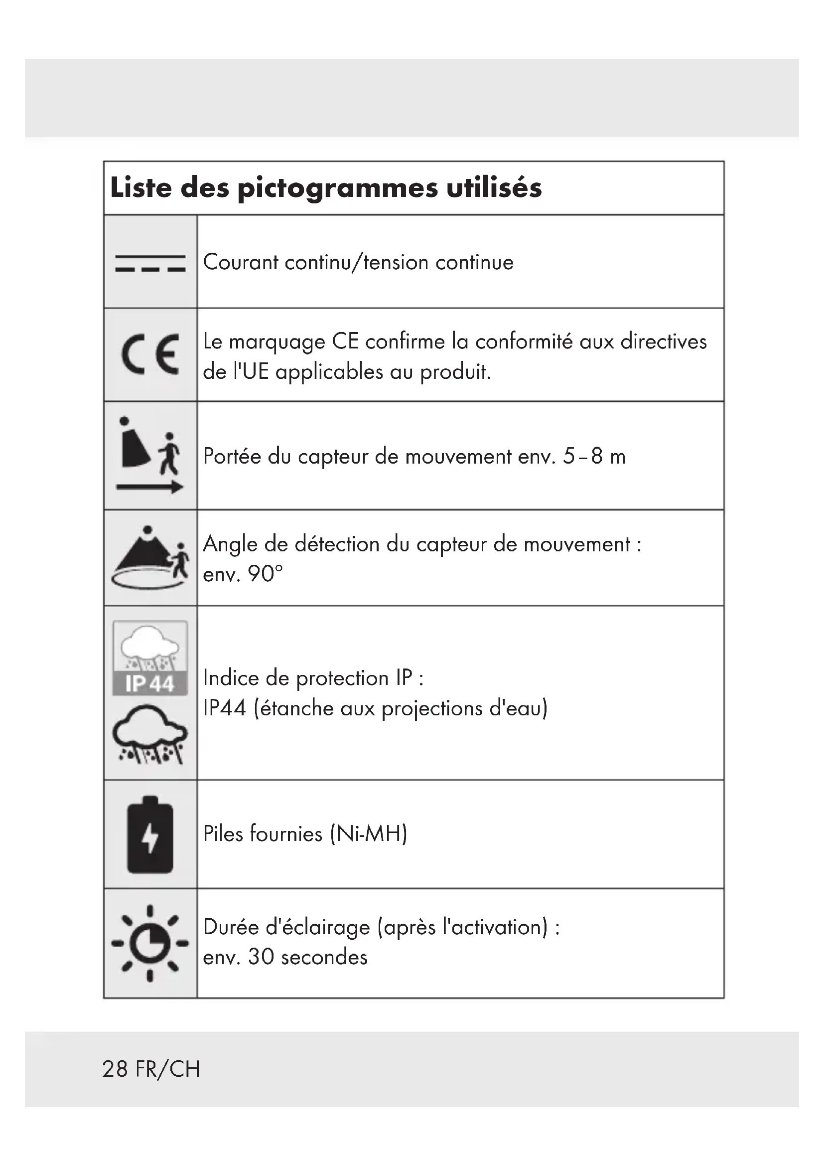DÉCHARGE ÉLECTRIQUE! N'utilisez pas de solvants, d'essence etc. sinon l'éclairage sera endommagé. Mettez l’interrupteur ON/OFF [2] du projecteur [3] en position «OFF». Débranchez la prise mâle [] de la prise femelle [] (uniquement HG04465B). Nettoyez l'éclairage avec un chiffon sec et non pelucheux. Branchez à nouveau la prise mâle [] avec la prise femelle [] (uniquement HG04465B). Mettez l’interrupteur ON/OFF [2] du projecteur [3] en position «ON». Vérifiez régulièrement l’état de propreté du capteur [4] et du panneau solaire [1]. Enlevez toutes les saletés pour assurer le bon fonctionnement du produit. Conservez le produit surtout en hiver sans neige et glace.45FR/CH Mise au rebut L’emballage se compose de matières recyclables pouvant être mises au rebut dans les déchetteries locales. Veuillez respecter l‘identification des matériaux d‘emballage pour le tri sélectif, ils sont identifiés avec des abbréviations (a) et des chiffres (b) ayant la signification suivante : 1–7 : plastiques / 20–22 : papiers et cartons / 80–98 : matériaux composite. Le produit et les matériaux d’emballage sont recyclables, mettez-les au rebut séparément pour un meilleur traitement des déchets. Le logo Triman n’est valable qu’en France. Votre mairie ou votre municipalité vous renseigneront sur les possibilités de mise au rebut des produits usagés. Afin de contribuer à la protection de l’environnement, veuillez ne pas jeter votre produit usagé dans les ordures ménagères, mais éliminez-le de manière appropriée. Pour obtenir des renseignements concernant les points de collecte et leurs horaires d’ouverture, vous pouvez contacter votre municipalité. Les piles / piles rechargeables défectueuses ou usagées doivent être recyclées conformément à la directive 2006/66/CE et ses modifications. Les piles et / ou piles rechargeables et / ou le produit doivent être retournés dans les centres de collecte proposés.46 FR/CH Pollution de l’environnement par la mise au rebut incorrecte des piles / piles rechargeables ! Les piles / piles rechargeables ne doivent pas être mises au rebut avec les ordures ménagères. Elles peuvent contenir des métaux lourds toxiques et doivent être considérées comme des déchets spéciaux. Les symboles chimiques des métaux lourds sont les suivants : Cd = cadmium, Hg = mercure, Pb = plomb. Pour cette raison, veuillez toujours déposer les piles / piles rechargeables usagées dans les conteneurs de recyclage communaux. Garantie Le produit a été fabriqué selon des critères de qualité stricts et contrôlé consciencieusement avant sa livraison. En cas de défaillance, vous êtes en droit de retourner ce produit au vendeur. La présente garantie ne constitue pas une restriction de vos droits légaux. Ce produit bénéficie d‘une garantie de 3 ans à compter de sa date d’achat. La durée de garantie débute à la date d’achat. Veuillez conserver le ticket de caisse original. Il fera office de preuve d’achat. Si un problème matériel ou de fabrication devait survenir dans 3 ans suivant la date d‘achat de ce produit, nous assurons à notre discrétion la réparation ou le remplacement du produit sans frais supplémentaires. La garantie prend fin si le produit est endommagé suite à une utilisation inappropriée ou à un entretien défaillant.47FR/CH La garantie couvre les vices matériels et de fabrication. Cette garantie ne s’étend ni aux pièces du produit soumises à une usure normale (p. ex. des piles) et qui, par conséquent, peuvent être considérées comme des pièces d’usure, ni aux dommages sur des composants fragiles, comme des interrupteurs, des batteries ou des éléments fabriqués en verre. Faire valoir sa garantie Pour garantir la rapidité d’exécution de la procédure de garantie, veuillez respecter les indications suivantes : Veuillez conserver le ticket de caisse et la référence du produit (IAN 374873_2104) à titre de preuve d’achat pour toute demande. Le numéro de référence de l’article est indiqué sur la plaque d’identification, gravé sur la page de titre de votre manuel (en bas à gauche) ou sur un autocollant apposé sur la face arrière ou inférieure du produit. En cas de dysfonctionnement du produit, ou de tout autre défaut, contactez en premier lieu le service après-vente par téléphone ou par e-mail aux coordonnées indiquées ci-dessous. Vous pouvez alors envoyer franco de port tout produit considéré comme défectueux au service clientèle indiqué, accompagné de la preuve d’achat (ticket de caisse) et d’une description écrite du défaut avec mention de sa date d’apparition.48 FR/CH Service après-vente Service après-vente France Tél.: 0800904879 E-Mail: owim@lidl.fr Service après-vente Suisse Tél.: 0800562153 E-Mail: owim@lidl.ch49IT/CH Elenco delle icone utilizzate .......... Pagina 50 Introduzione............................ Pagina 51 Uso previsto .............................. Pagina 51 Descrizione dei componenti.................. Pagina 52 Dati tecnici ............................... Pagina 53 Contenuto della confezione.................. Pagina 53 Avvertenze generali per la sicurezza................................ Pagina 54 Istruzioni di sicurezza per le batterie/batterie ricaricabili ............................... Pagina 55 Prima dell'uso .......................... Pagina 57 Caricamento delle batterie ricaricabili.......... Pagina 58 Inserimento / sostituzione delle batterie ................................. Pagina 59 Montaggio.............................. Pagina 60 Messa in funzione ..................... Pagina 65 Manutenzione e pulizia............... Pagina 66 Smaltimento............................ Pagina 67 Garanzia................................ Pagina 6850 IT/CH Elenco delle icone utilizzate Corrente/tensione continua Il marchio CE conferma la conformità alle direttive UE applicabili al prodotto. Portata del sensore di mo