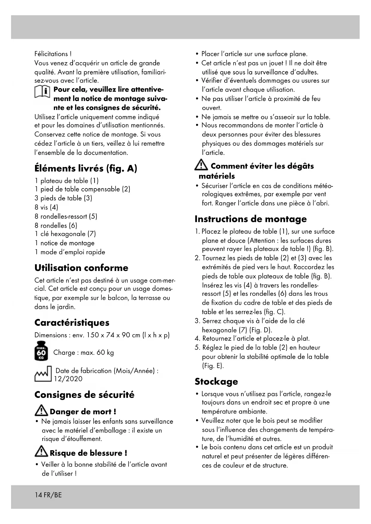 - s‘il présente les qualités qu‘un acheteur peut légitimement attendre eu égard aux décla- rations publiques faites par le vendeur, par le producteur ou par son représentant, notam- ment dans la publicité ou l‘étiquetage ; 2° Ou s‘il présente les caractéristiques définies d‘un commun accord par les parties ou être propre à tout usage spécial recherché par l‘acheteur, porté à la connaissance du vendeur et que ce dernier a accepté. Article L217-12 du Code de la consommation L‘action résultant du défaut de conformité se prescrit par deux ans à compter de la délivrance du bien. Article 1641 du Code civil Le vendeur est tenu de la garantie à raison des défauts cachés de la chose vendue qui la rendent impropre à l‘usage auquel on la destine, ou qui diminuent tellement cet usage que l‘acheteur ne l‘aurait pas acquise, ou n‘en aurait donné qu‘un moindre prix, s‘il les avait connus. Article 1648 1er alinéa du Code civil L‘action résultant des vices rédhibitoires doit être intentée par l‘acquéreur dans un délai de deux ans à compter de la découverte du vice. Les pièces détachées indispensables à l’utili- sation du produit sont disponibles pendant la durée de la garantie du produit. IAN : 353363_2007 Service France Tel. : 0800 919270 E-Mail : deltasport@lidl.fr Service Belgique Tel. : 070 270 171 (0,15 EUR/Min.) E-Mail : deltasport@lidl.be FR/BE17 Gefeliciteerd! Met uw aankoop hebt u voor een hoogwaardig artikel gekozen. Zorg ervoor dat u voor het eerste gebruik met het artikel vertrouwd raakt. Lees hiervoor de volgende montagehandleiding en de veiligheidstips zorgvuldig door. Gebruik het artikel alleen zoals omschreven en voor het aangegeven doel. Bewaar deze mon- tagehandleiding goed. Geef alle documenten mee als u het artikel aan iemand anders geeft. In het leveringspakket inbegrepen (afb. A) 1 x tafelblad (1) 1 x tafelpoot in hoogte verstelbaar (2) 3 x tafelpoot (3) 8 x schroef (4) 8 x veerring (5) 8 x onderlegplaatje (6) 1 x binnenzeskantsleutel (7) 1 x montagehandleiding 1 x korte handleiding Voorgeschreven gebruik Het artikel is niet bestemd voor commercieel ge- bruik. Het artikel is ontworpen voor het gebruik in woongedeelten, bv. balkon, terras of tuin. Technische gegevens Afmetingen: ca. 150 x 74 x 90 cm (b x h x d) Maximale belasting:. 60 kg Productiedatum (maand/jaar): 12/2020 Veiligheidsinstructies Levensgevaar!