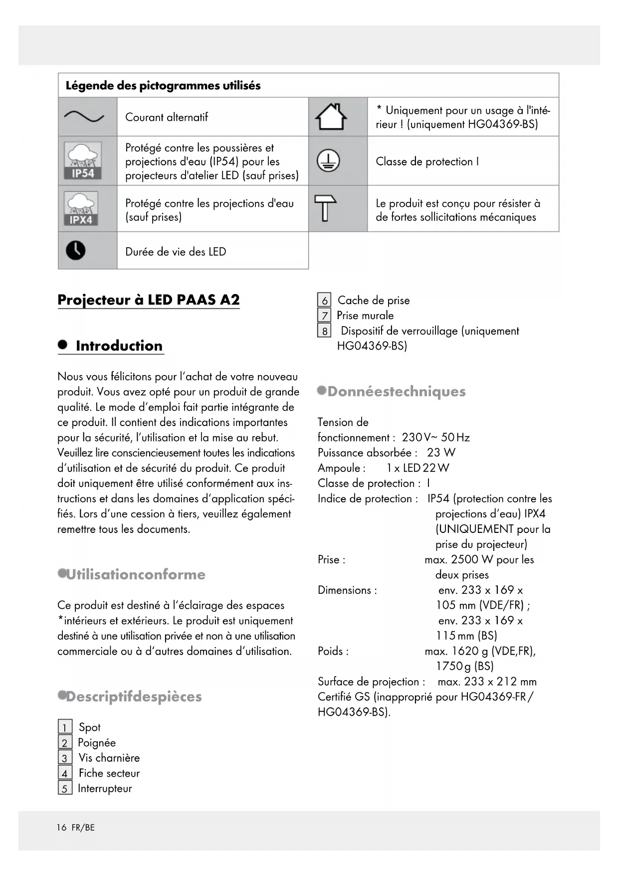 Dispositif de verrouillage (uniquement HG04369-BS) Données techniques Tension de fonctionnement : 230 V∼ 50 Hz Puissance absorbée : 23 W Ampoule : 1 x LED 22 W Classe de protection : I Indice de protection : IP54 (protection contre les projections d‘eau) IPX4 (UNIQUEMENT pour la prise du projecteur) Prise : max. 2500 W pour les deux prises Dimensions: env. 233 x 169 x 105 mm (VDE/FR) ; env. 233 x 169 x 115 mm (BS) Poids : max. 1620 g (VDE,FR), 1750 g (BS) Surface de projection : max. 233 x 212 mm Certifié GS (inapproprié pour HG04369-FR / HG04369-BS).17 FR/BE ATTENTION ! Des rayonnements optiques dangereux peuvent être émis par ce produit. Ne pas regarder la source lumineuse en utilisation normale. Cela peut être dangereux pour les yeux. Groupe de risque 2 Produit testé selon l’EN 62471 Contenu de la livraison Immédiatement après le déballage du produit, veuillez toujours contrôler que le contenu de la livraison est complet et que le produit est en parfait état. 1 phare à LED 1 mode d‘emploi Instructions générales de sécurité