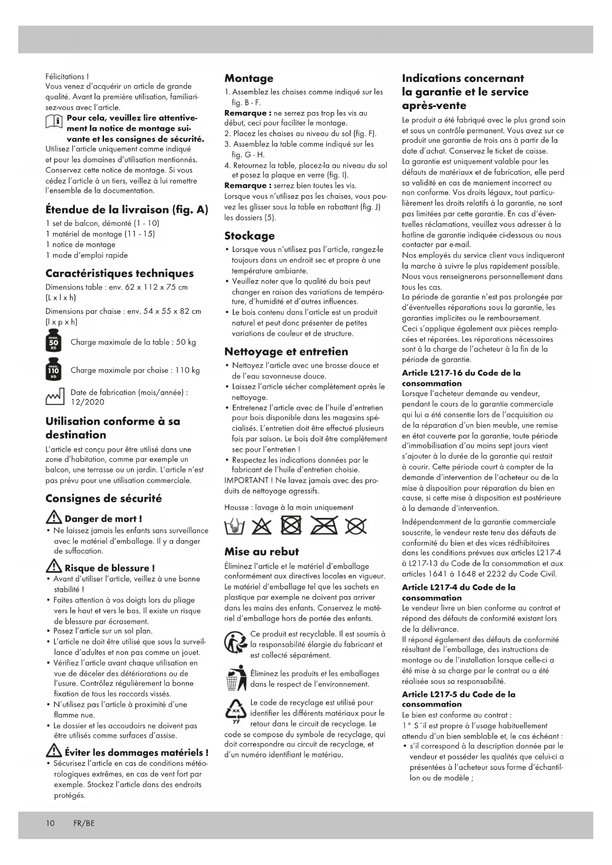 Remarque: serrez bien toutes les vis. Lorsque vous n'utilisez pas les chaises, vous pouvez les glisser sous la table en rabattant (fig. J) les dossiers (5).