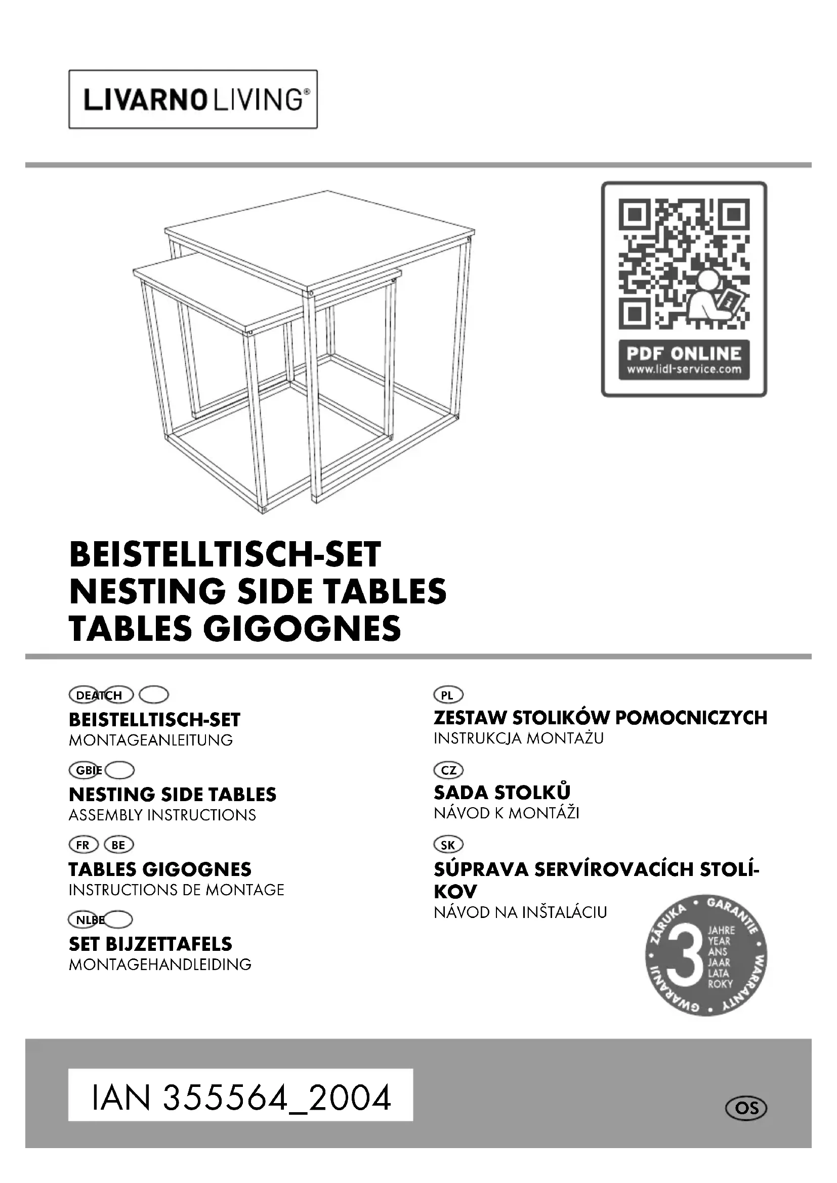 Type : Tables gigognes IAN : 355564_2004 N° Tradix : 355564-20-A Dimensions : - Grande table : env. 45 x 45 x 45,5 cm (L x P x H) - Petite table : env. 40 x 40 x 40,5 cm (L x P x H) Charge max. : - Grande table : env. 7 kg - Petite table : env. 5 kg Poids total : 6.9 kg Matériau : Bois, métal Date de production : 08/2020 Garantie: 3 ans