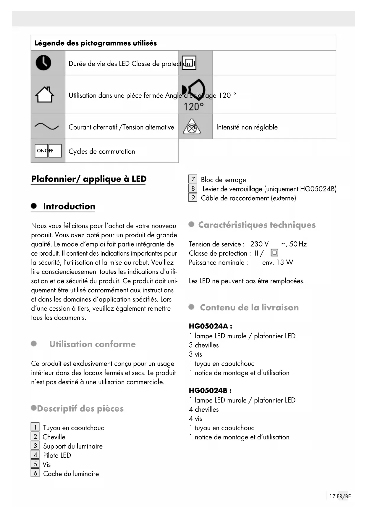 , 50 Hz Classe de protection : II / Puissance nominale: env. 13 W Les LED ne peuvent pas être remplacées. Contenu de la livraison HG05024A : 1 lampe LED murale / plafonnier LED 3 chevilles 3 vis 1 tuyau en caoutchouc 1 notice de montage et d‘utilisation HG05024B : 1 lampe LED murale / plafonnier LED 4 chevilles 4 vis 1 tuyau en caoutchouc 1 notice de montage et d‘utilisation18 FR/BE Sécurité Indications de sécurité