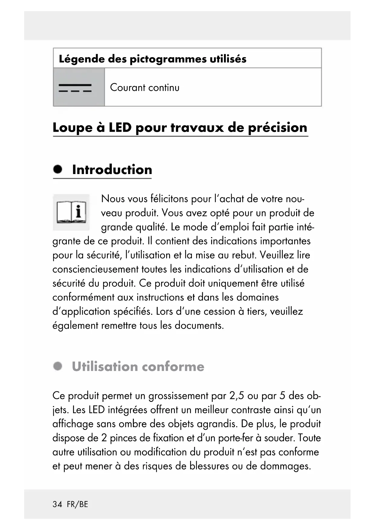 Observe the marking of the packaging materials for waste separation, which are marked with abbreviations (a) and numbers (b) with following31 GB/IE meaning: 1–7: plastics / 20–22: paper and fibreboard / 80–98: composite materials. The product and packaging materials are recyclable, dispose of it separately for better waste treatment. The Triman logo is valid in France only. Contact your local refuse disposal authority for more details of how to dispose of your worn-out product. To help protect the environment, please dispose of the product properly when it has reached the end of its useful life and not in the household waste. Information on collection points and their opening hours can be obtained from your local authority. Faulty or used batteries / rechargeable batteries must be recycled in accordance with Directive 2006/66/EC and its amendments. Please return the batteries / rechargeable bat- teries and / or the product to the available collection points. Environmental damage through incorrect disposal of the batteries / rechargeable batteries! Batteries / rechargeable batteries may not be disposed of with the usual domestic waste. They may contain toxic heavy metals and are subject to hazardous waste treatment rules and regulations. The chemical symbols for heavy metals are32 GB/IE as follows: Cd = cadmium, Hg = mercury, Pb = lead. That is why you should dispose of used batteries / rechargeable batteries at a local collection point. Service Service Great Britain Tel.: 0800 404 7657 E-Mail: owim@lidl.co.uk Service Ireland Tel.: 1890 930 034 (0,08 EUR / Min., (peak)) (0,06 EUR / Min., (off peak)) E-Mail: owim@lidl.ie33 FR/BE Légende des pictogrammes utilisés .....................................................................Page 34 Introduction ........................................................Page 34 Utilisation conforme .................................................Page 34 Description des pièces et éléments .........................Page 35 Données techniques ................................................. Page 36 Contenu de livraison ................................................ Page 36 Sécurité ..................................................................Page 37 Instructions générales de sécurité ...........................Page 37 Consignes de sécurité relatives aux piles / aux piles rechargeables ..................................................Page 39 Avant la mise en service ..........................Page 40 Mise en place des piles ........................................... Page 41 Fixation du dispositif de réparation ........................Page 41 Montage de la loupe ...............................................Page 42 Placer le pied............................................................Page 42 Utilisation ............................................................. Page 42 Utilisation du produit ................................................Page 42 Remplacement des piles ..........................................Page 43 Solution aux problèmes .......................... Page 43 Nettoyage et entretien ............................. Page 44 Mise au rebut .................................................... Page 45 Service après-vente ..................................... Page 4634 FR/BE Légende des pictogrammes utilisés Courant continu Loupe à LED pour travaux de précision Introduction Nous vous félicitons pour l‘achat de votre nou- veau produit. Vous avez opté pour un produit de grande qualité. Le mode d‘emploi fait partie inté- grante de ce produit. Il contient des indications importantes pour la sécurité, l’utilisation et la mise au rebut. Veuillez lire consciencieusement toutes les indications d‘utilisation et de sécurité du produit. Ce produit doit uniquement être utilisé conformément aux instructions et dans les domaines d‘application spécifiés. Lors d‘une cession à tiers, veuillez également remettre tous les documents. Utilisation conforme Ce produit permet un grossissement par 2,5 ou par 5 des ob- jets. Les LED intégrées offrent un meilleur contraste ainsi qu‘un affichage sans ombre des objets agrandis. De plus, le produit dispose de 2 pinces de fixation et d’un porte-fer à souder. Toute autre utilisation ou modification du produit n‘est pas conforme et peut mener à des risques de blessures ou de dommages.35 FR/BE Le fabriquant n‘assume aucune responsabilité pour les dom- mages causés suite à une utilisation contraire à celle décrite. Ce produit est exclusivement conçu pour un usage intérieur. Ce produit n‘est pas destiné à un usage commercial, ni à un autre domaine d‘utilisation. Ce produit ne peut pas servir d‘éclairage de pi- èce. Description des pièces et éléments