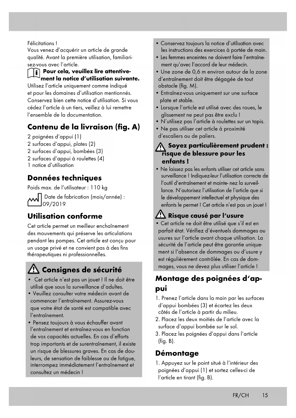 contre l‘autre. L‘encliquetage des fermetures doit être audible. Ce faisant, veillez au positionnement correct des dispositifs de fermeture (fig. A). Démontage / Montage des surfaces d‘appui bombées Pour démonter : appuyez sur les deux fermetures vers l‘intérieur et enlevez la surface d‘appui bombée de l‘article. Pour monter : enfoncez les fermetures des surfaces bombées dans le trou de l‘article prévu à cet effet. L‘encliquetage de la surface bombée doit être audible. Consignes générales pour l‘entraînement Déroulement de l‘entraînement