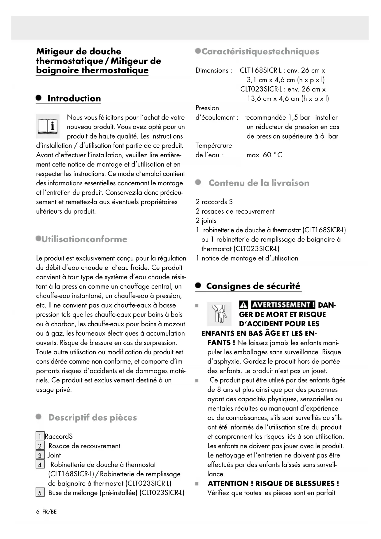 1 robinetterie de remplissage de baignoire à thermostat (CLT023SICR-L) 1 notice de montage et d‘utilisation Consignes de sécurité DAN-