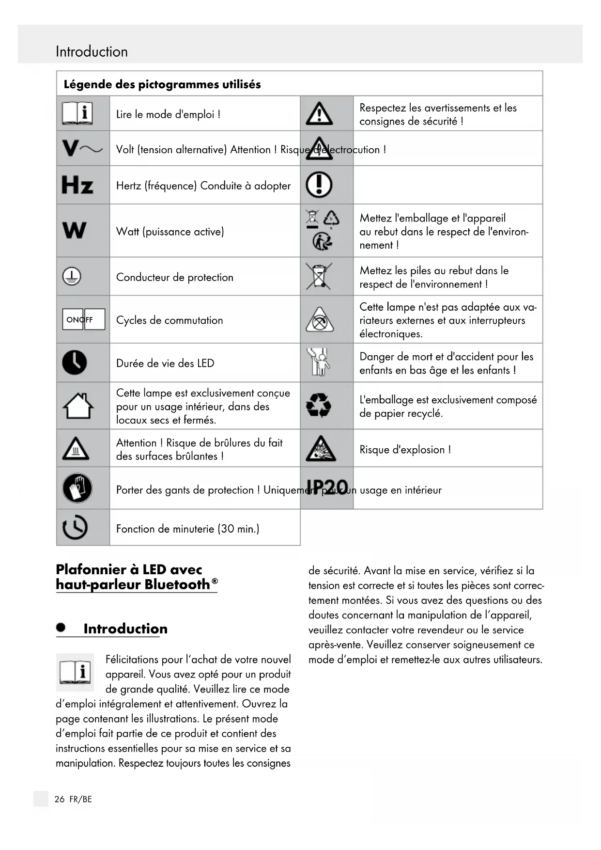 , 50 Hz Puissance nominale totale : max. 25 W (LED 20 W, haut-parleur 5 W) Classe de protection : | / Type de protection: IP20 LED: Ampoule: Module LED Puissance nominale : LED, max. 17,5 W Type de protection: IP20 Enceinte / Bluetooth : Plage de fréquence Enceinte : 120 ‒ 20000 Hz Version Bluetooth : 5.0 Portée Bluetooth : < 10 m Plage de fréquence Fréquence Bluetooth : 2,4 GHz, bande de fréquence ISM Puissance HF : max. +2 dBm Télécommande: Piles : 2 x 1,5 V AAA Portée de la télécommande : 5‒6 m (infrarouge)28 FR/BE Sécurité Sécurité Indications de sécurité Les droits de recours en garantie sont annulés en cas de dommages résultant du non-respect du présent mode d’emploi ! Le fabricant décline toute respon- sabilité pour les dommages indirects ! De même, toute responsabilité est déclinée pour les dommages matériels ou corporels causés par une manipulation incorrecte ou par le non-respect des consignes de sécurité !