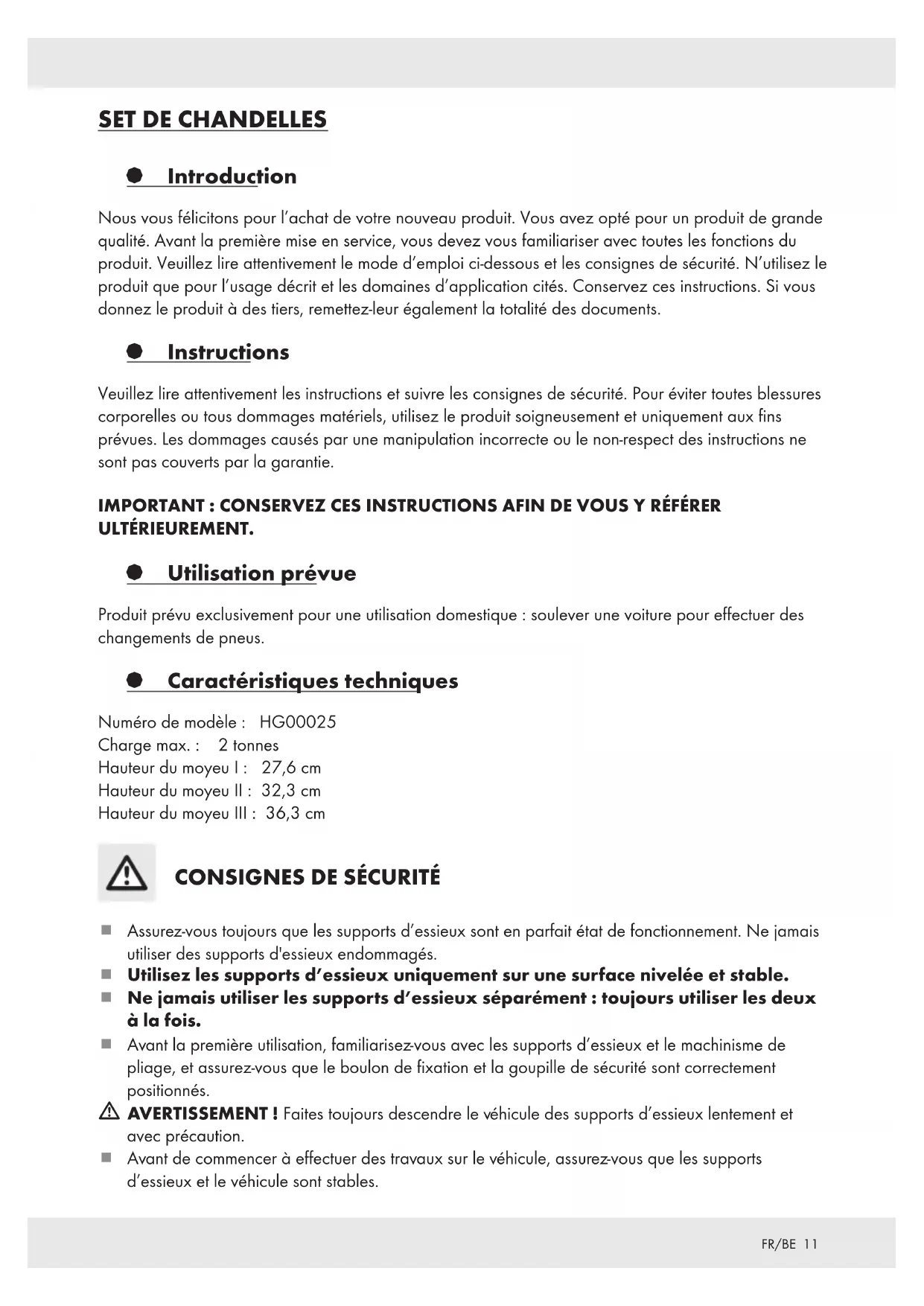 § Introduction Nous vous félicitons pour l’achat de votre nouveau produit. Vous avez opté pour un produit de grande qualité. Avant la première mise en service, vous devez vous familiariser avec toutes les fonctions du produit. Veuillez lire attentivement le mode d’emploi ci-dessous et les consignes de sécurité. N’utilisez le produit que pour l’usage décrit et les domaines d’application cités. Conservez ces instructions. Si vous donnez le produit à des tiers, remettez-leur également la totalité des documents. § Instructions Veuillez lire attentivement les instructions et suivre les consignes de sécurité. Pour éviter toutes blessures corporelles ou tous dommages matériels, utilisez le produit soigneusement et uniquement aux fins prévues. Les dommages causés par une manipulation incorrecte ou le non-respect des instructions ne sont pas couverts par la garantie. IMPORTANT : CONSERVEZ CES INSTRUCTIONS AFIN DE VOUS Y RÉFÉRER ULTÉRIEUREMENT. § Utilisation prévue Produit prévu exclusivement pour une utilisation domestique : soulever une voiture pour effectuer des changements de pneus. § Caractéristiques techniques Numéro de modèle: HG00025 Charge max.: 2 tonnes Hauteur du moyeu I : 27,6 cm Hauteur du moyeu II : 32,3 cm Hauteur du moyeu III : 36,3 cm